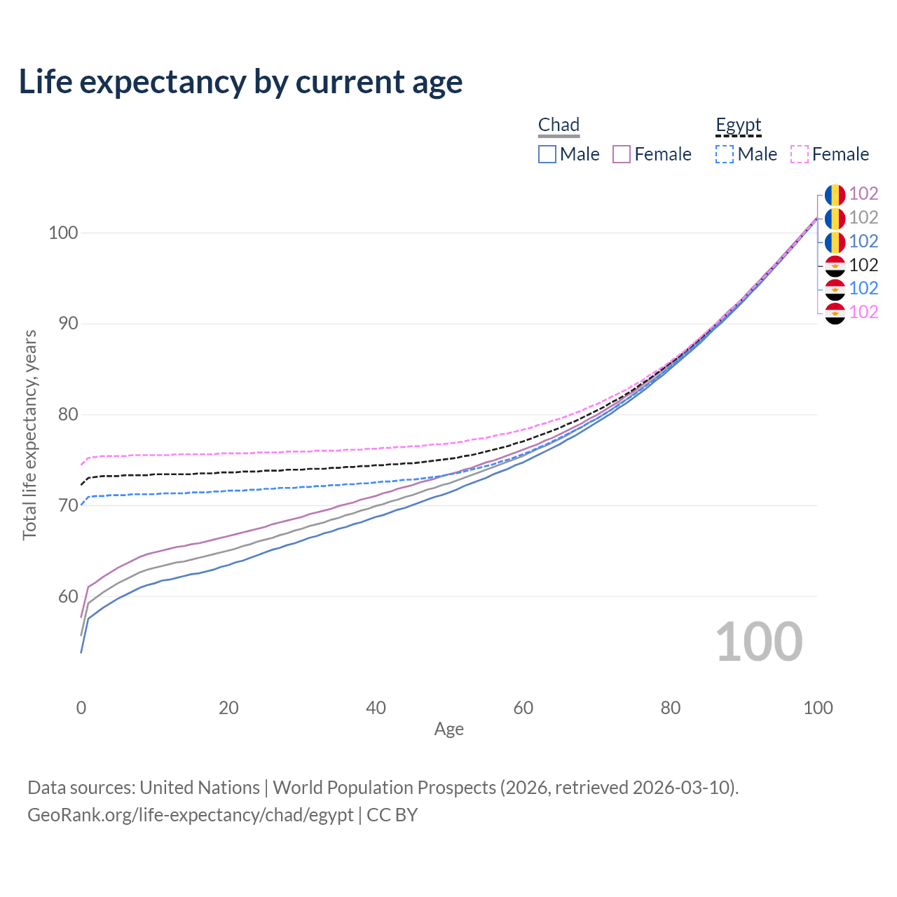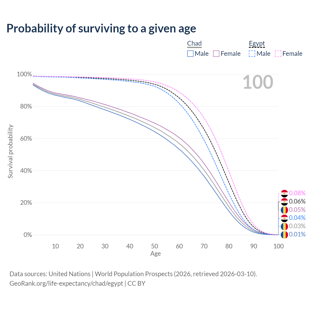 This life expectancy calculator shows the odds of living to 100, 95, 90, and below based on current age for both males and females in Chad and Egypt, along with mean and median age of death. The calculations are based on the 2026 life tables (actuarial tables) from the UN World Population Prospects.