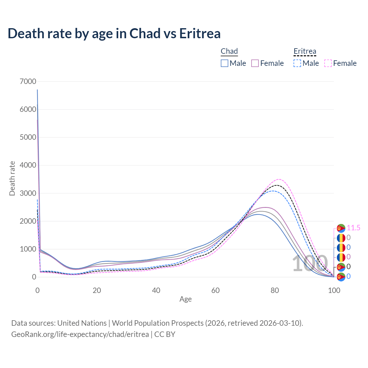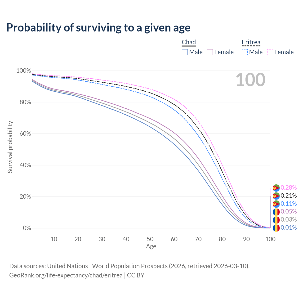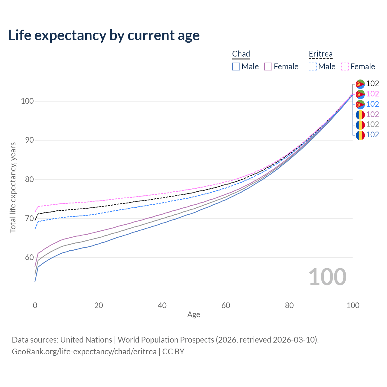 This life expectancy calculator shows the odds of living to 100, 95, 90, and below based on current age for both males and females in Chad and Eritrea, along with mean and median age of death. The calculations are based on the 2026 life tables (actuarial tables) from the UN World Population Prospects.