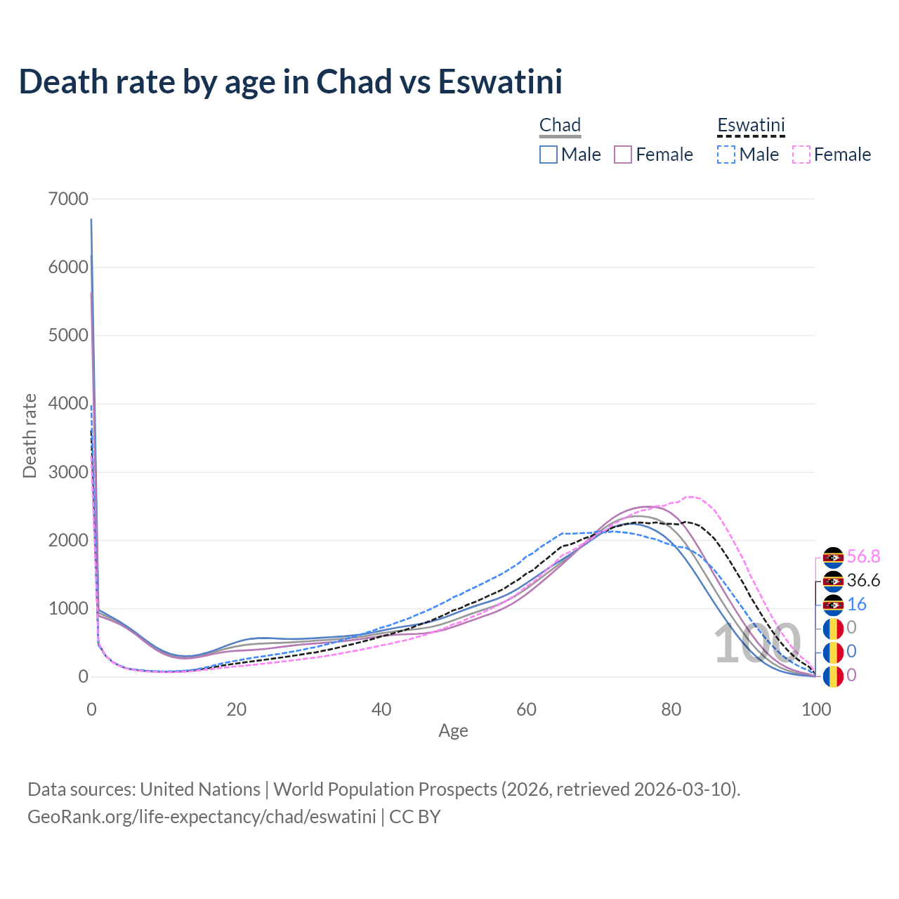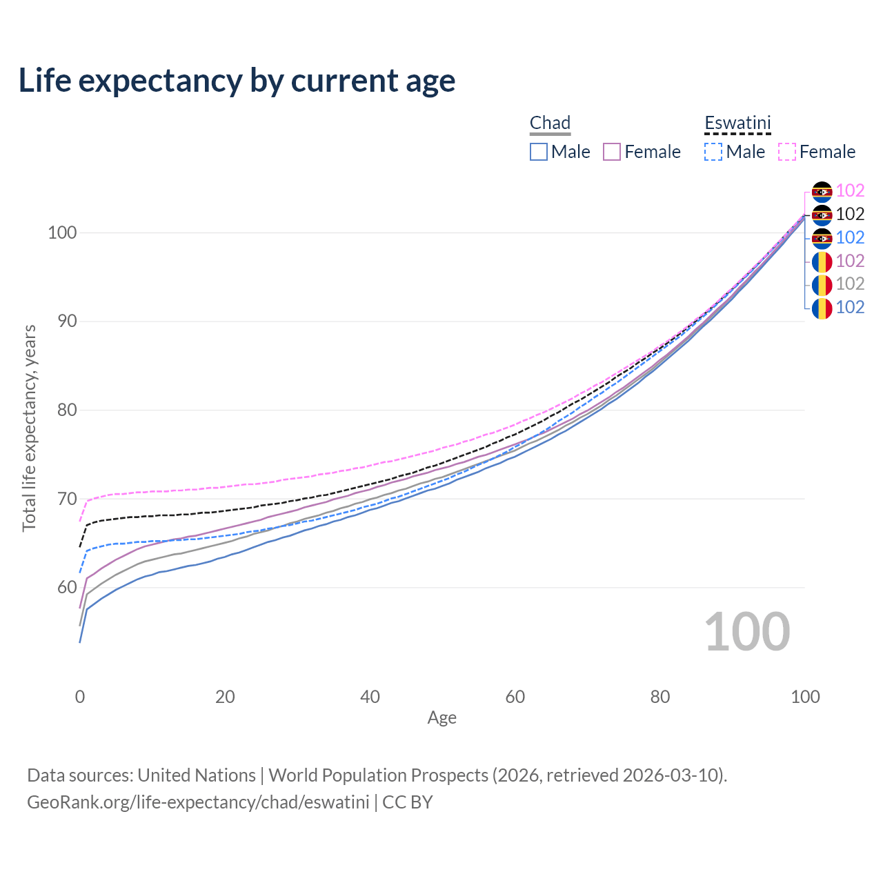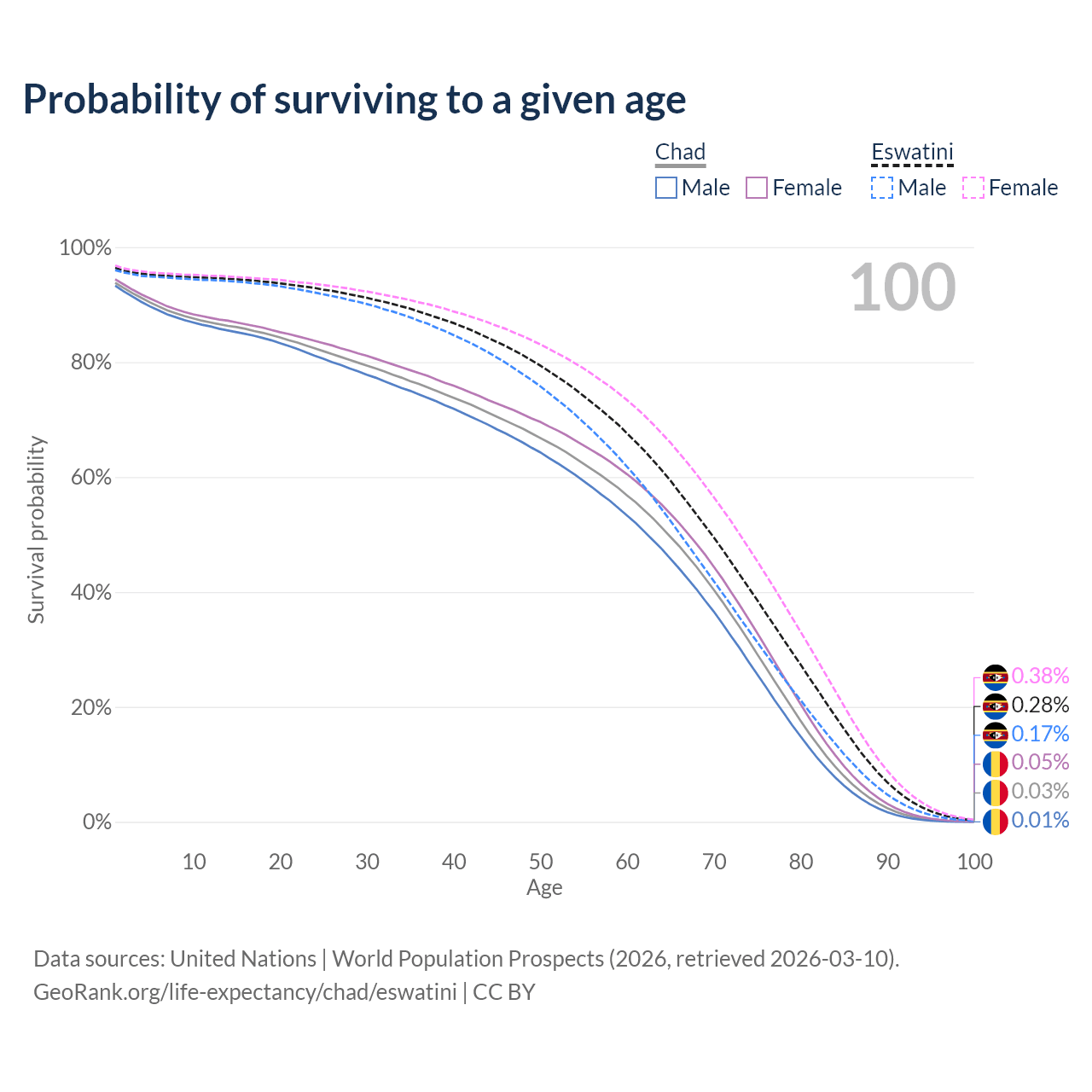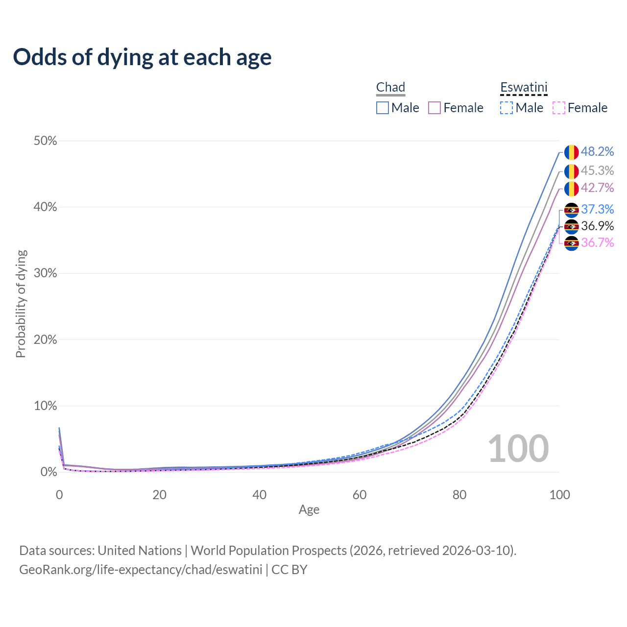 This life expectancy calculator shows the odds of living to 100, 95, 90, and below based on current age for both males and females in Chad and Eswatini, along with mean and median age of death. The calculations are based on the 2026 life tables (actuarial tables) from the UN World Population Prospects.