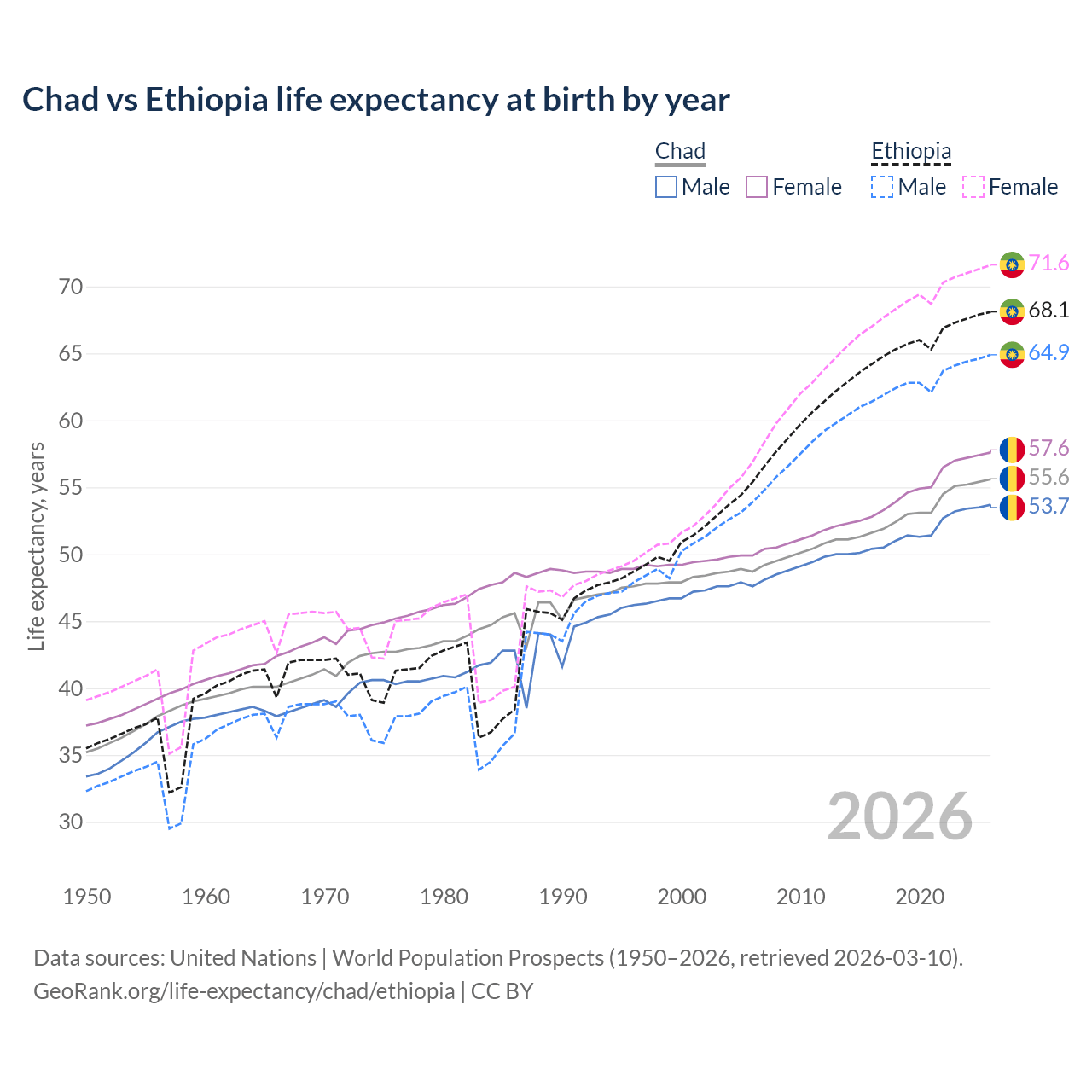 The average life expectancy at birth is 55.6 years in Chad vs 68.1 in Ethiopia. Chad is ranked 196/197 by life expectancy, and Ethiopia is 150/197. In Chad, the life expectancy is 53.7 years for males and 57.6 years for females. In Ethiopia, it's 64.9 years for males and 71.6 years for females.