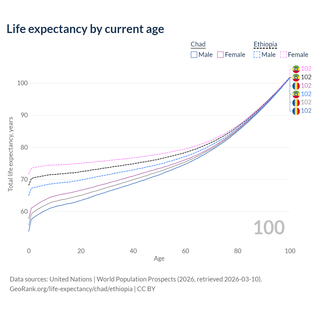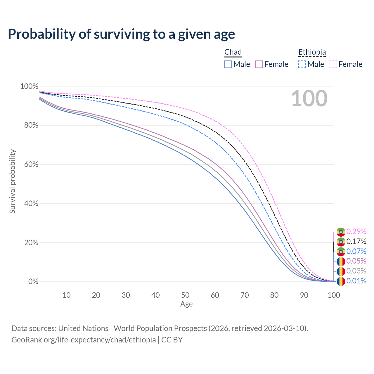 This life expectancy calculator shows the odds of living to 100, 95, 90, and below based on current age for both males and females in Chad and Ethiopia, along with mean and median age of death. The calculations are based on the 2026 life tables (actuarial tables) from the UN World Population Prospects.