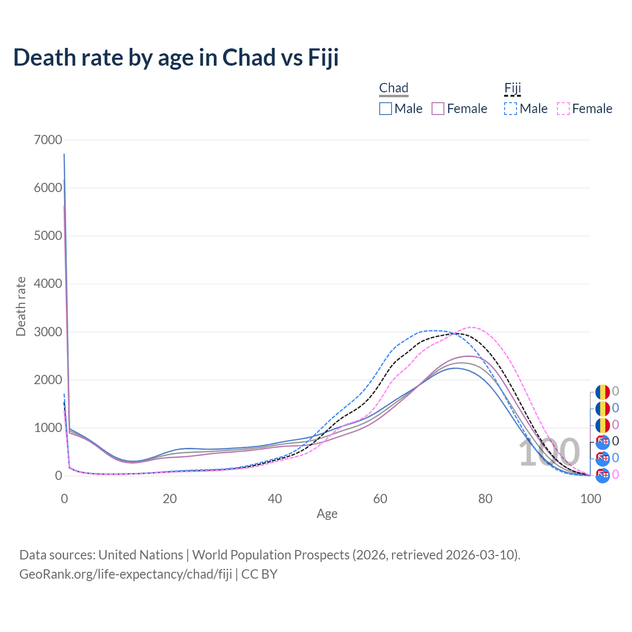 The average life expectancy at birth is 55.6 years in Chad vs 67.8 in Fiji. Chad is ranked 196/197 by life expectancy, and Fiji is 154/197. In Chad, the life expectancy is 53.7 years for males and 57.6 years for females. In Fiji, it's 65.7 years for males and 69.9 years for females.