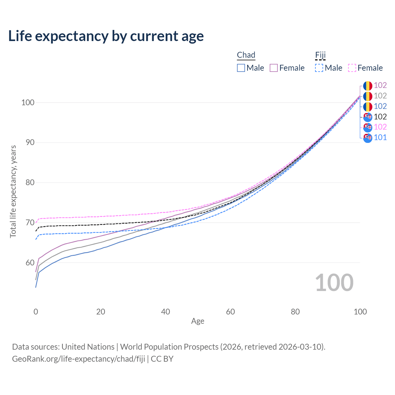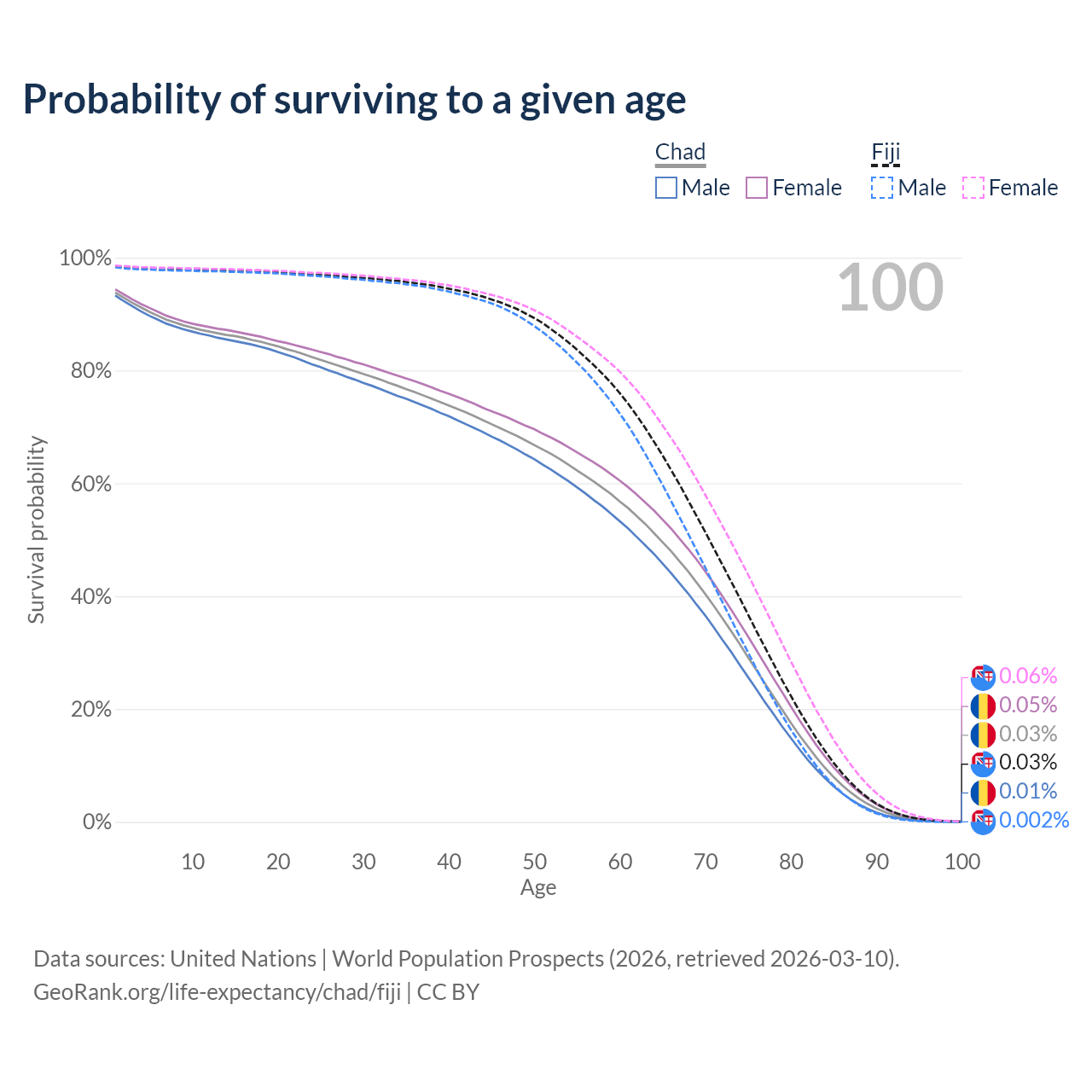 This life expectancy calculator shows the odds of living to 100, 95, 90, and below based on current age for both males and females in Chad and Fiji, along with mean and median age of death. The calculations are based on the 2026 life tables (actuarial tables) from the UN World Population Prospects.