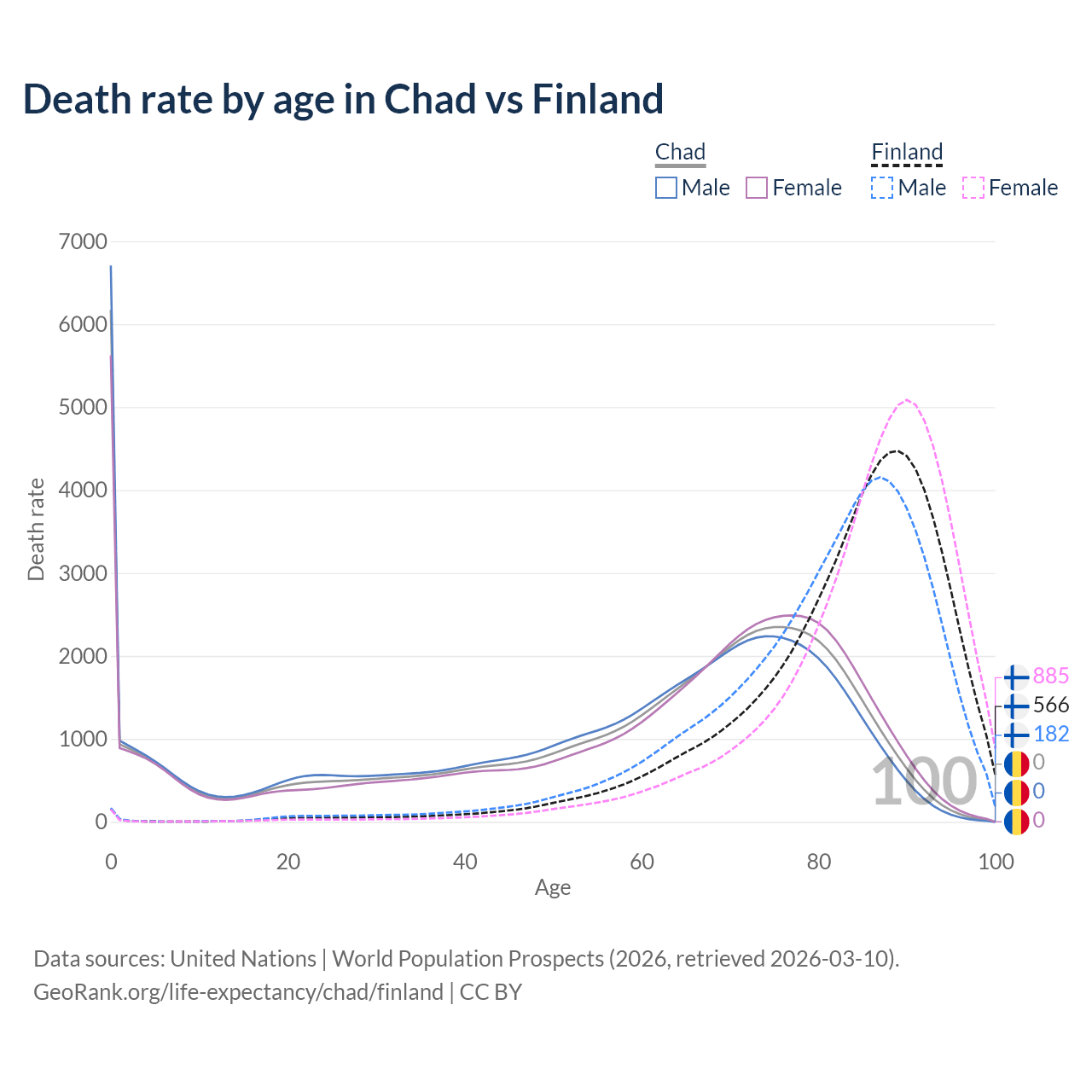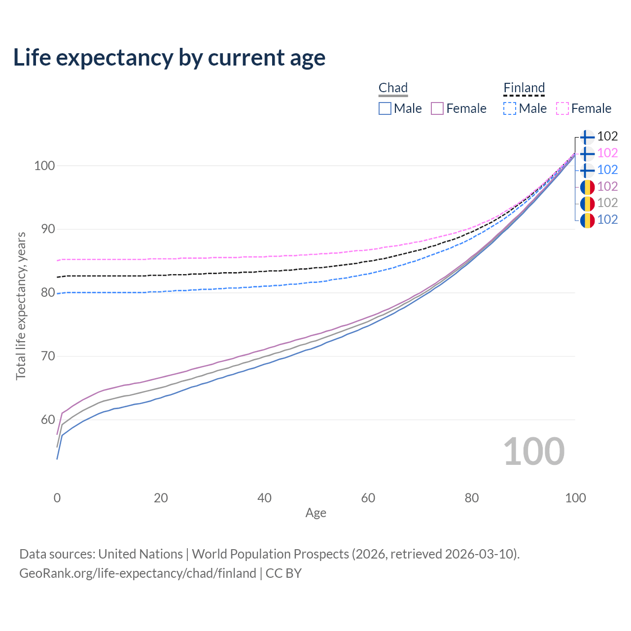 This life expectancy calculator shows the odds of living to 100, 95, 90, and below based on current age for both males and females in Chad and Finland, along with mean and median age of death. The calculations are based on the 2026 life tables (actuarial tables) from the UN World Population Prospects.