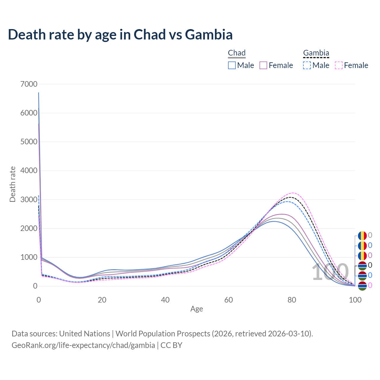 In Chad, the most common age of death is 0, compared to 80 in the Gambia. The median age of death is 64.8 in Chad and 73.4 in the Gambia, meaning only half of each cohort is expected to live past that age.