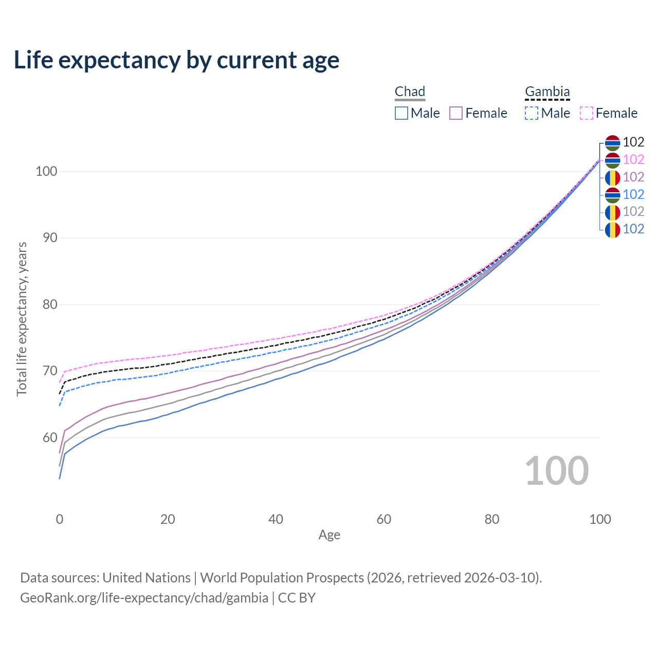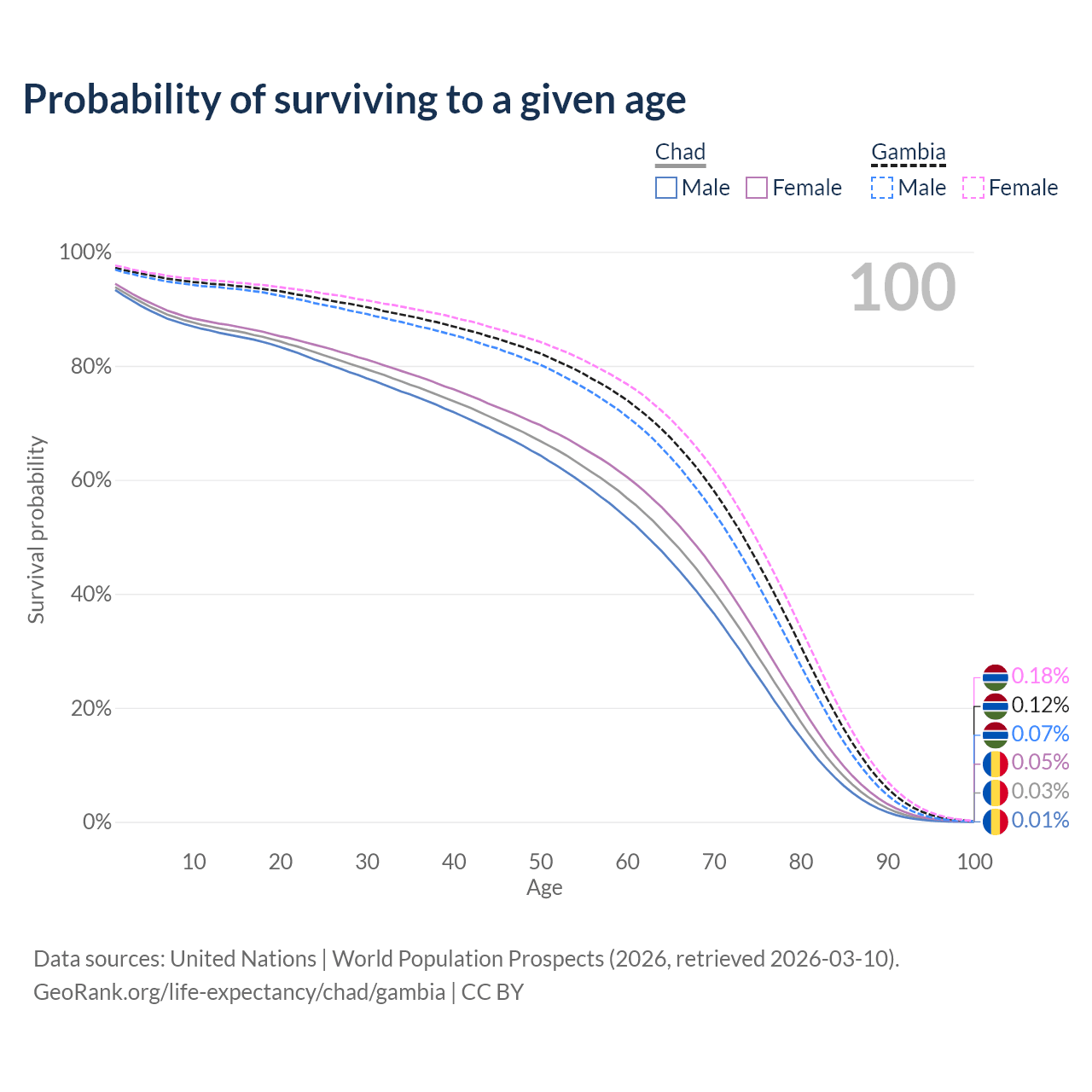 This life expectancy calculator shows the odds of living to 100, 95, 90, and below based on current age for both males and females in Chad and the Gambia, along with mean and median age of death. The calculations are based on the 2026 life tables (actuarial tables) from the UN World Population Prospects.