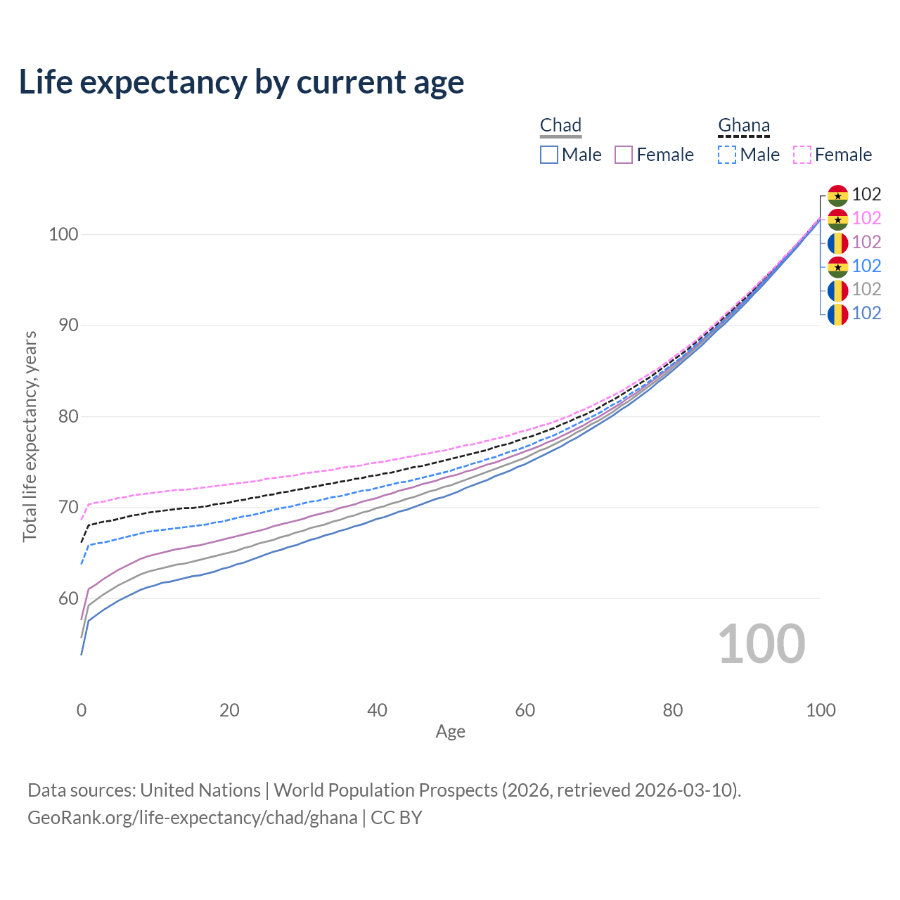 This life expectancy calculator shows the odds of living to 100, 95, 90, and below based on current age for both males and females in Chad and Ghana, along with mean and median age of death. The calculations are based on the 2026 life tables (actuarial tables) from the UN World Population Prospects.