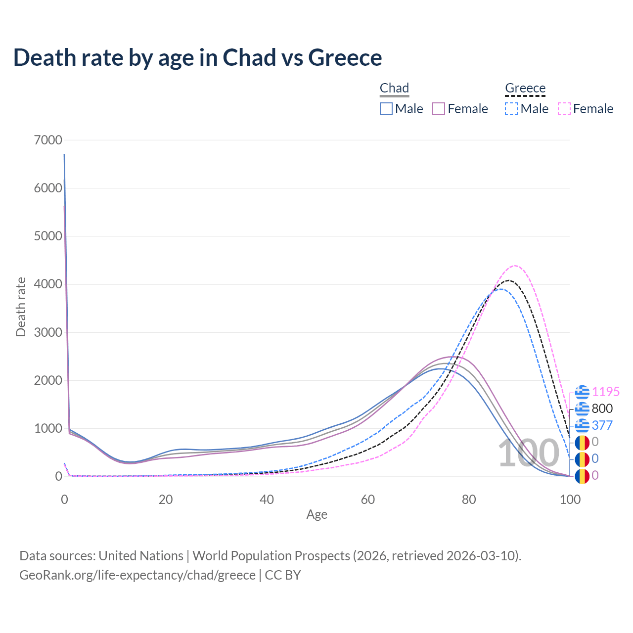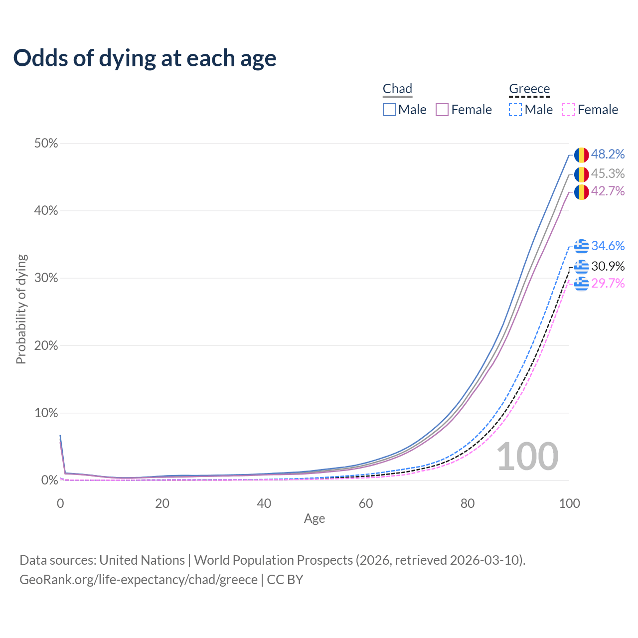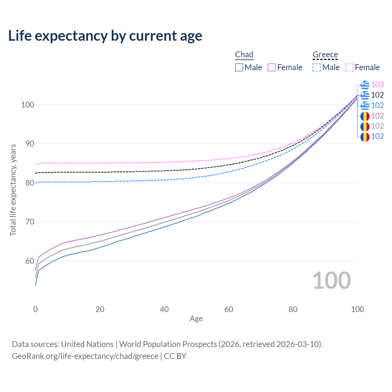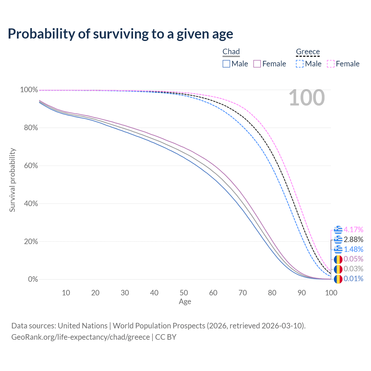 This life expectancy calculator shows the odds of living to 100, 95, 90, and below based on current age for both males and females in Chad and Greece, along with mean and median age of death. The calculations are based on the 2026 life tables (actuarial tables) from the UN World Population Prospects.