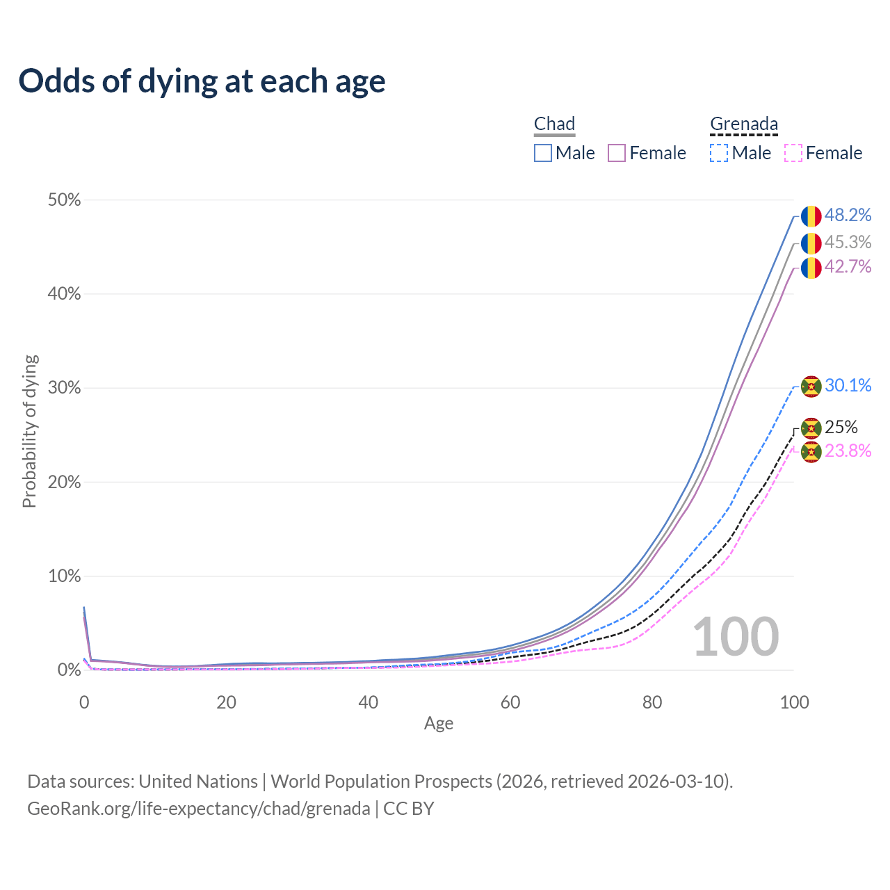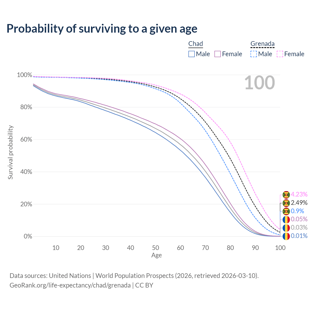 This life expectancy calculator shows the odds of living to 100, 95, 90, and below based on current age for both males and females in Chad and Grenada, along with mean and median age of death. The calculations are based on the 2026 life tables (actuarial tables) from the UN World Population Prospects.
