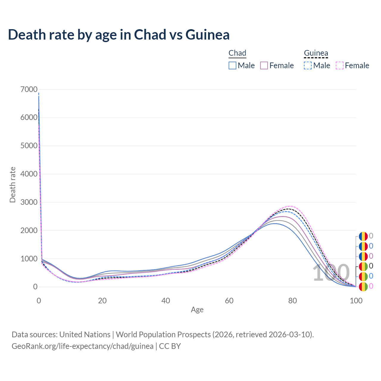 In Chad, the most common age of death is 0, compared to 0 in Guinea. The median age of death is 64.8 in Chad and 70.6 in Guinea, meaning only half of each cohort is expected to live past that age.