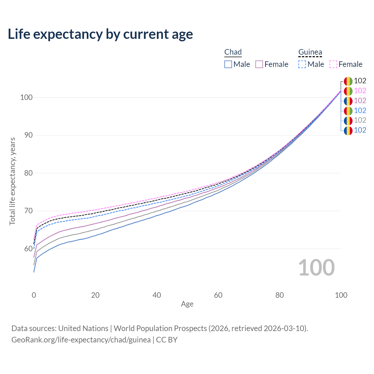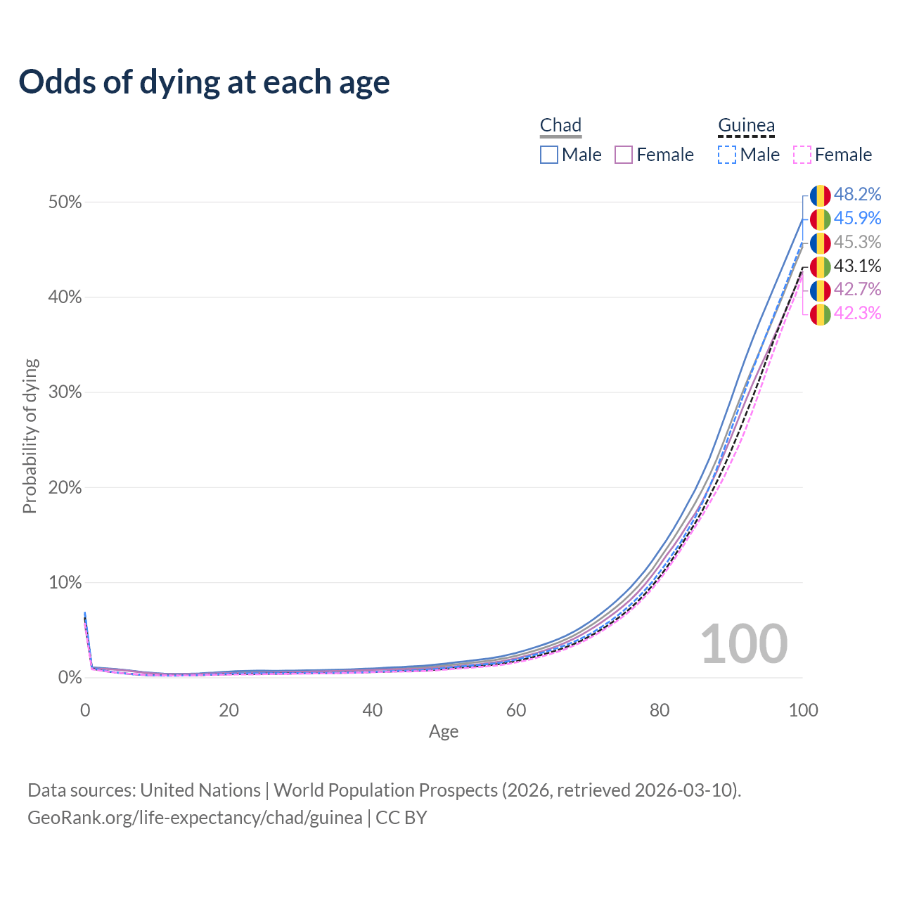This life expectancy calculator shows the odds of living to 100, 95, 90, and below based on current age for both males and females in Chad and Guinea, along with mean and median age of death. The calculations are based on the 2026 life tables (actuarial tables) from the UN World Population Prospects.