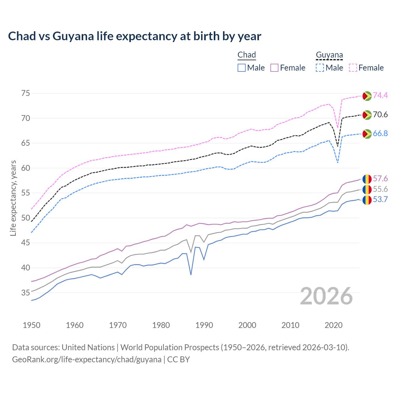 The average life expectancy at birth is 55.6 years in Chad vs 70.6 in Guyana. Chad is ranked 196/197 by life expectancy, and Guyana is 134/197. In Chad, the life expectancy is 53.7 years for males and 57.6 years for females. In Guyana, it's 66.8 years for males and 74.4 years for females.