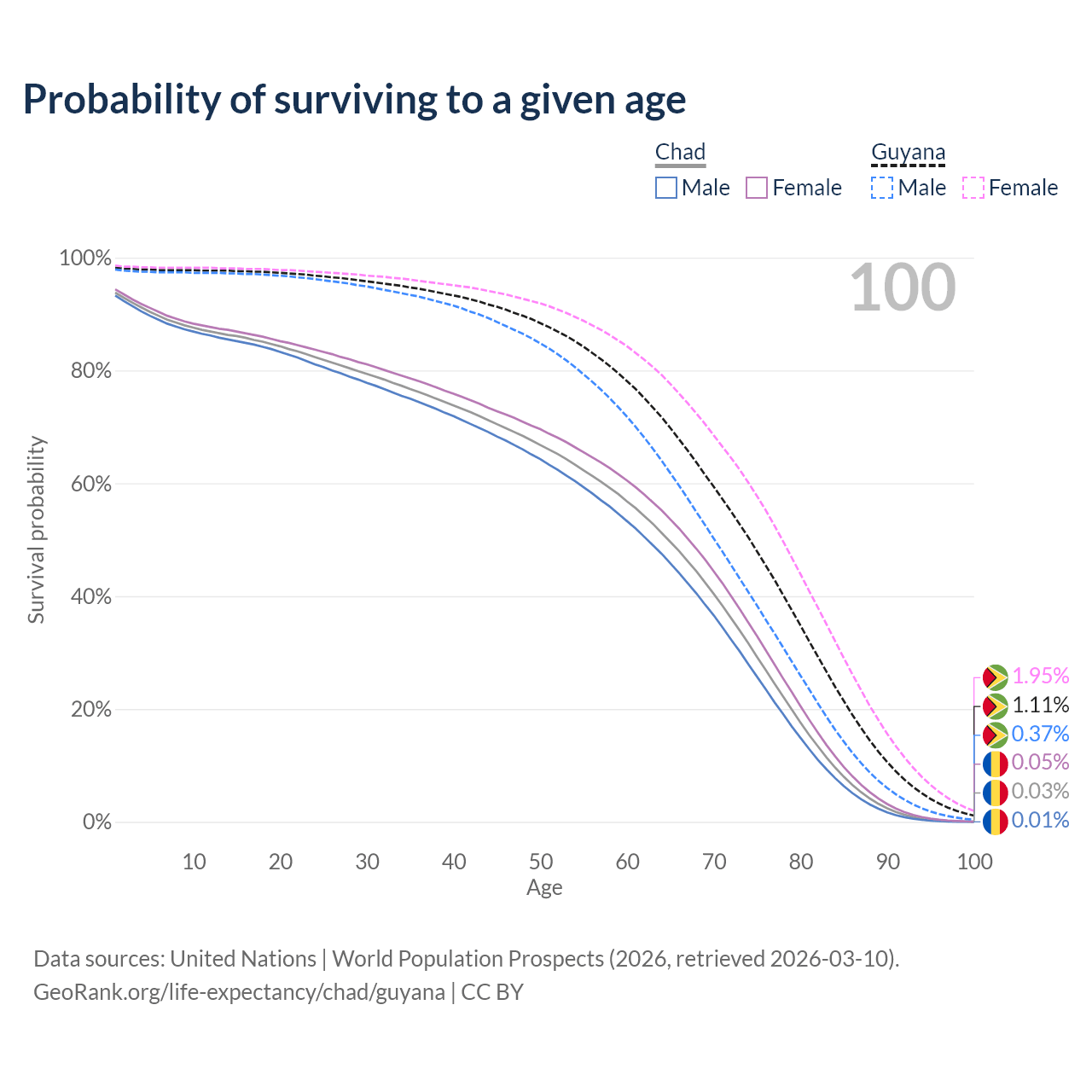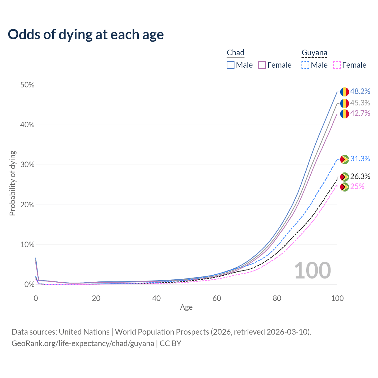 This life expectancy calculator shows the odds of living to 100, 95, 90, and below based on current age for both males and females in Chad and Guyana, along with mean and median age of death. The calculations are based on the 2026 life tables (actuarial tables) from the UN World Population Prospects.