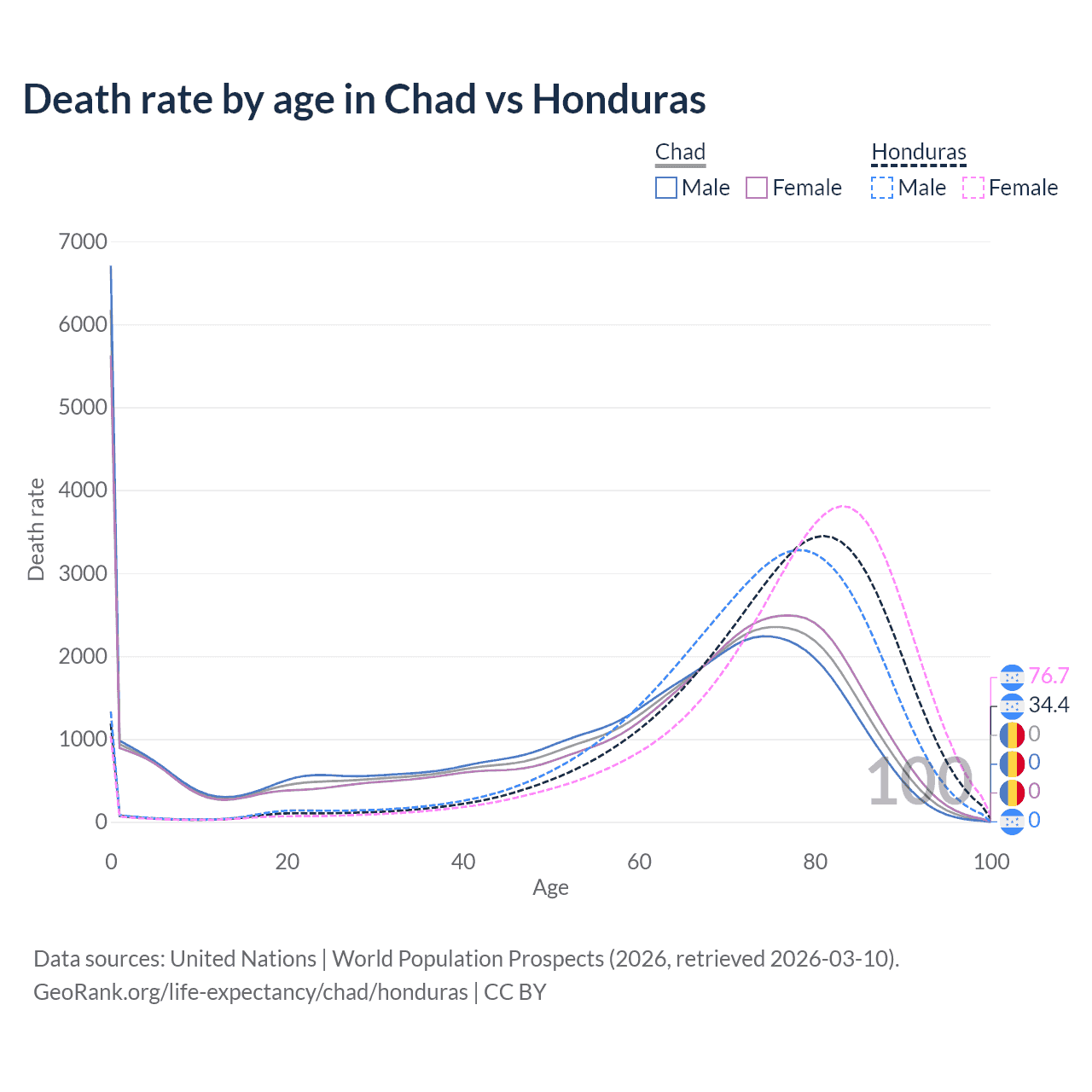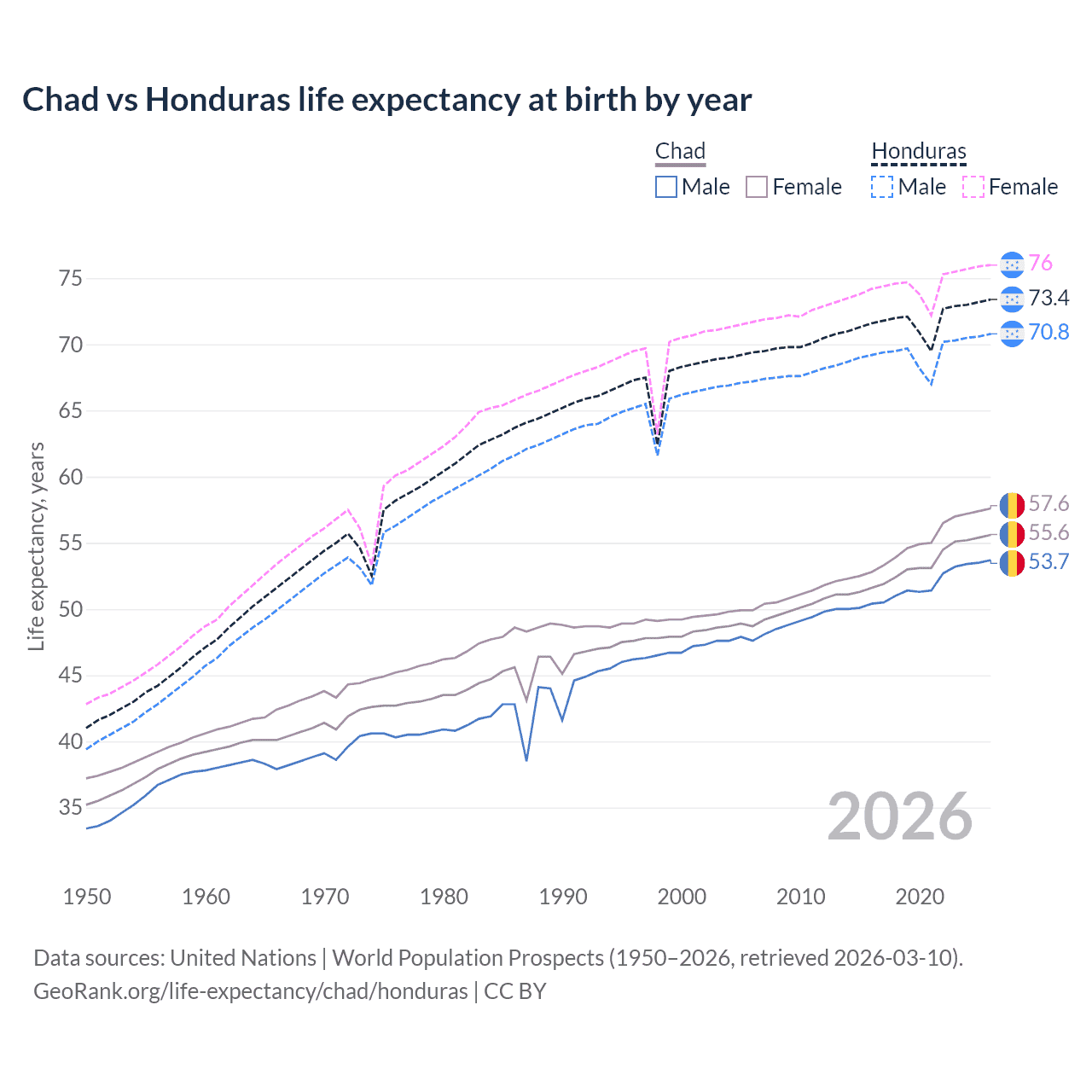 The average life expectancy at birth is 55.6 years in Chad vs 73.4 in Honduras. Chad is ranked 196/197 by life expectancy, and Honduras is 110/197. In Chad, the life expectancy is 53.7 years for males and 57.6 years for females. In Honduras, it's 70.8 years for males and 76 years for females.
