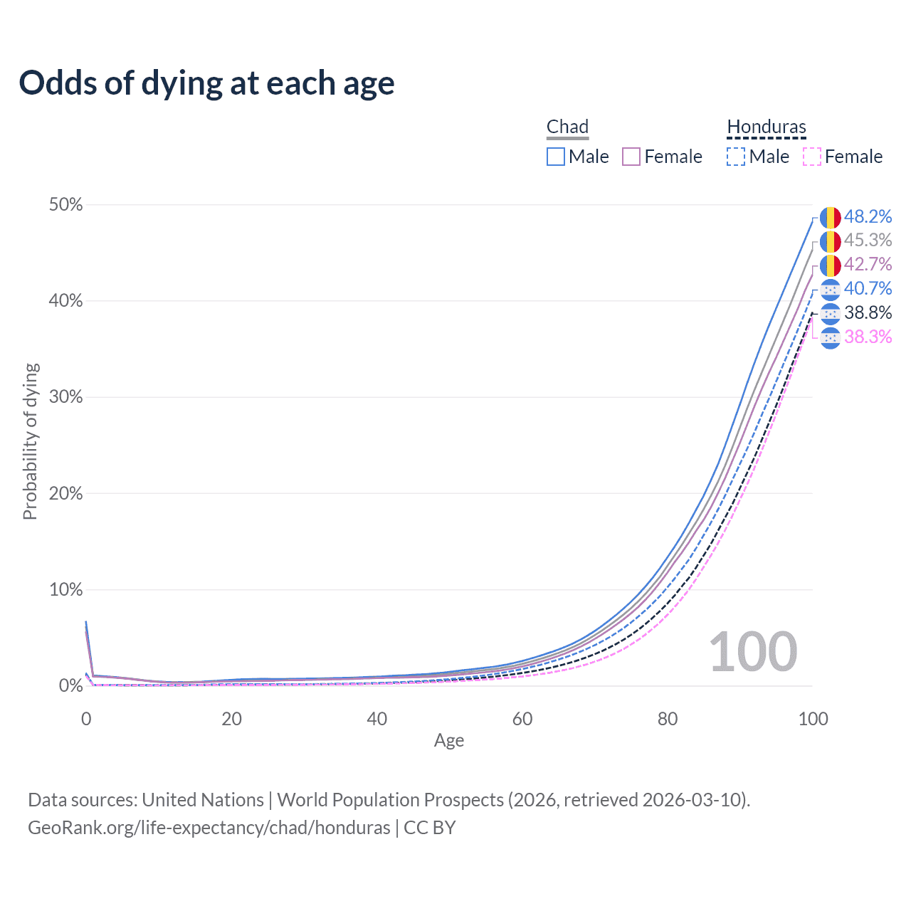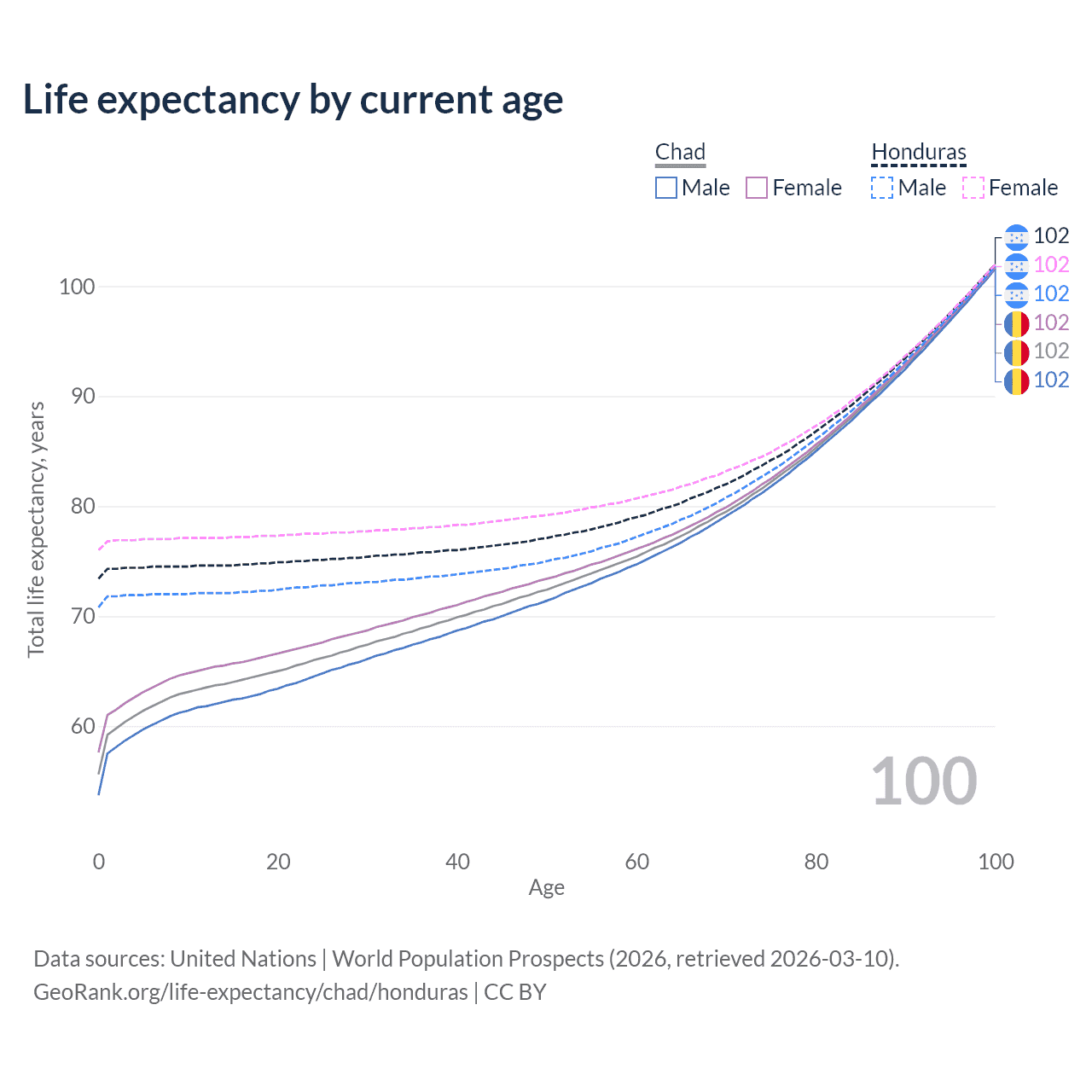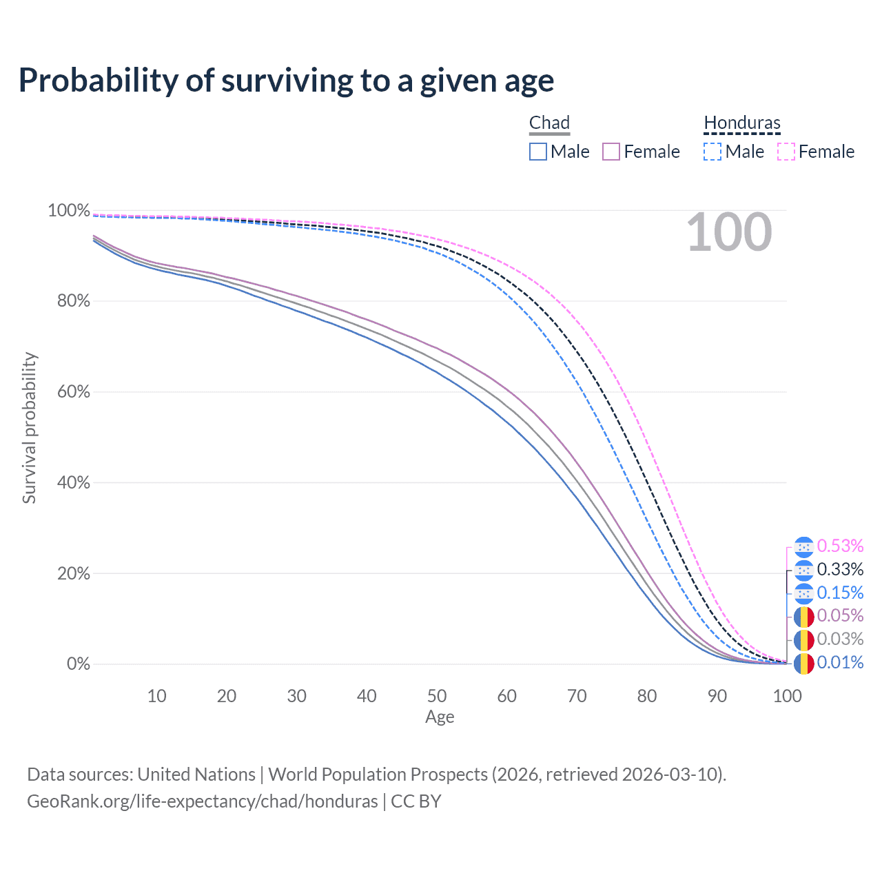 This life expectancy calculator shows the odds of living to 100, 95, 90, and below based on current age for both males and females in Chad and Honduras, along with mean and median age of death. The calculations are based on the 2026 life tables (actuarial tables) from the UN World Population Prospects.