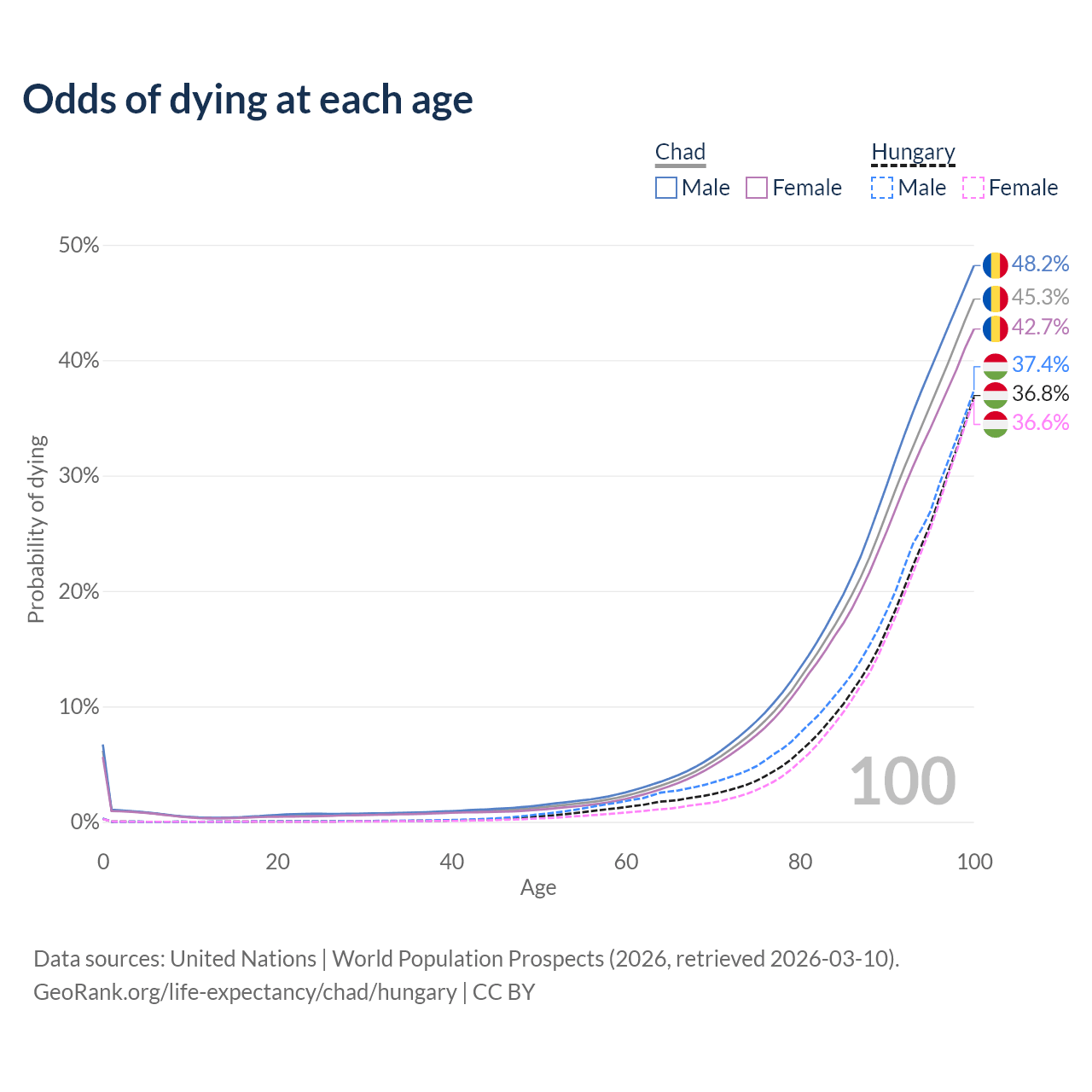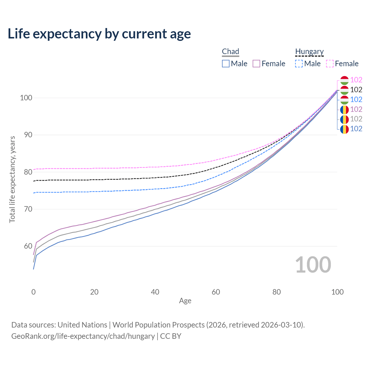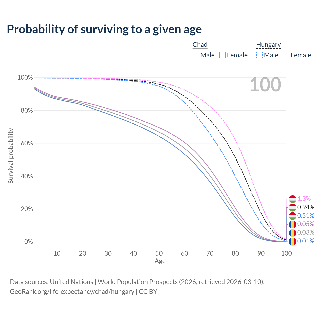 This life expectancy calculator shows the odds of living to 100, 95, 90, and below based on current age for both males and females in Chad and Hungary, along with mean and median age of death. The calculations are based on the 2026 life tables (actuarial tables) from the UN World Population Prospects.