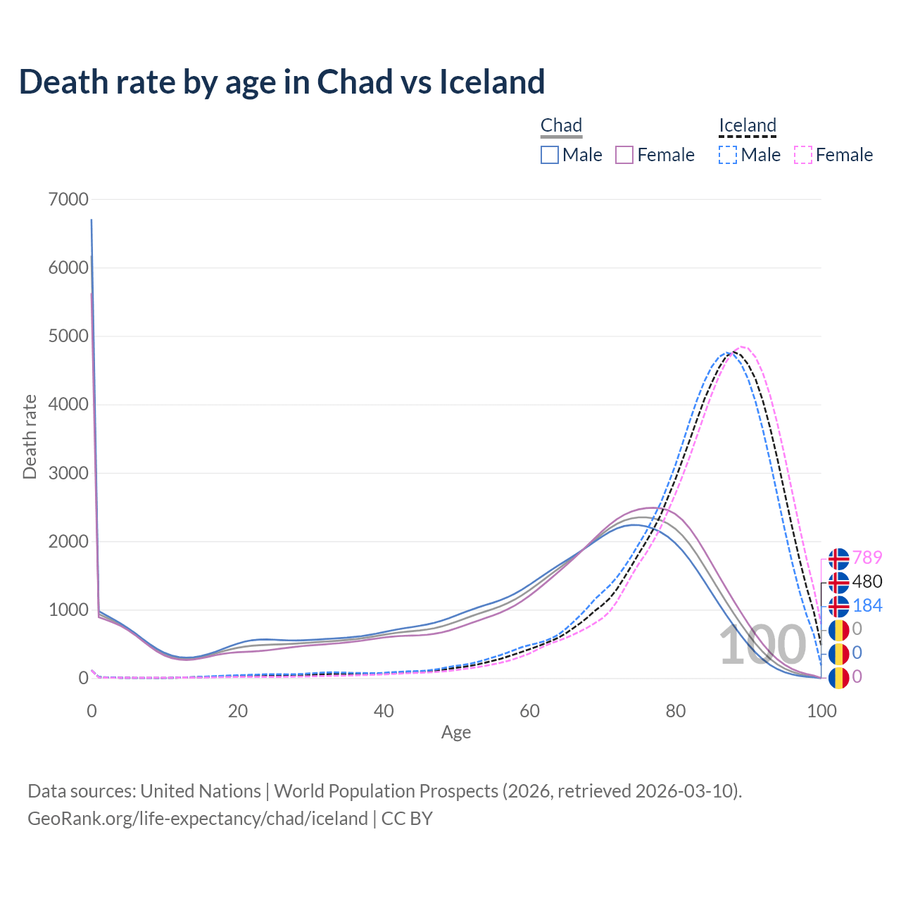 The average life expectancy at birth is 55.6 years in Chad vs 83.3 in Iceland. Chad is ranked 196/197 by life expectancy, and Iceland is 18/197. In Chad, the life expectancy is 53.7 years for males and 57.6 years for females. In Iceland, it's 82 years for males and 84.7 years for females.
