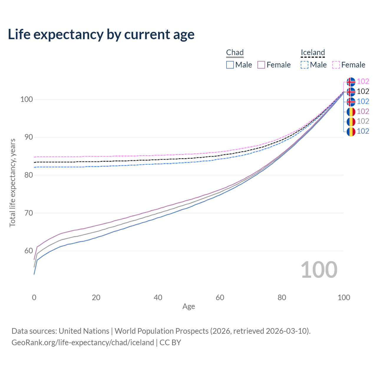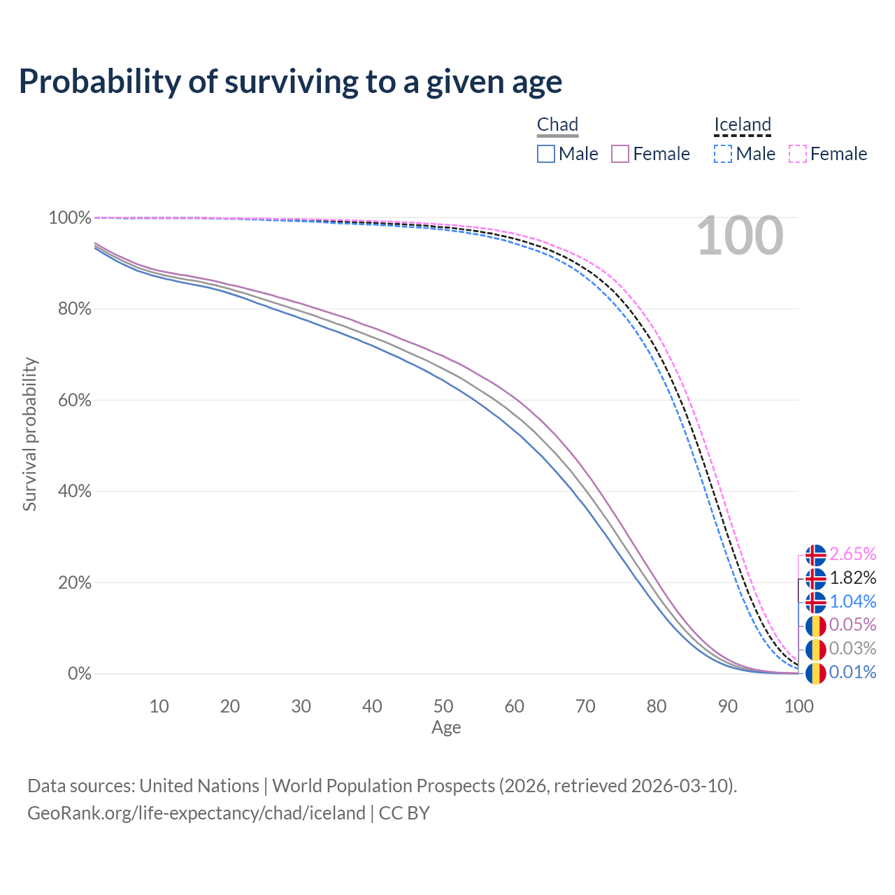 This life expectancy calculator shows the odds of living to 100, 95, 90, and below based on current age for both males and females in Chad and Iceland, along with mean and median age of death. The calculations are based on the 2026 life tables (actuarial tables) from the UN World Population Prospects.