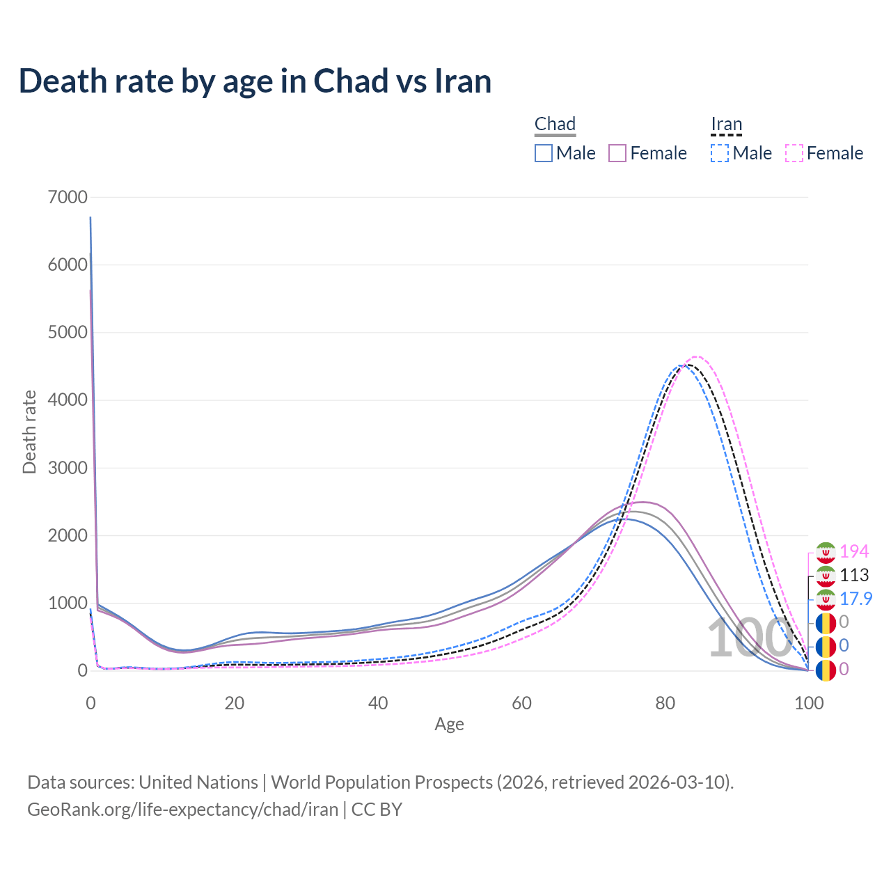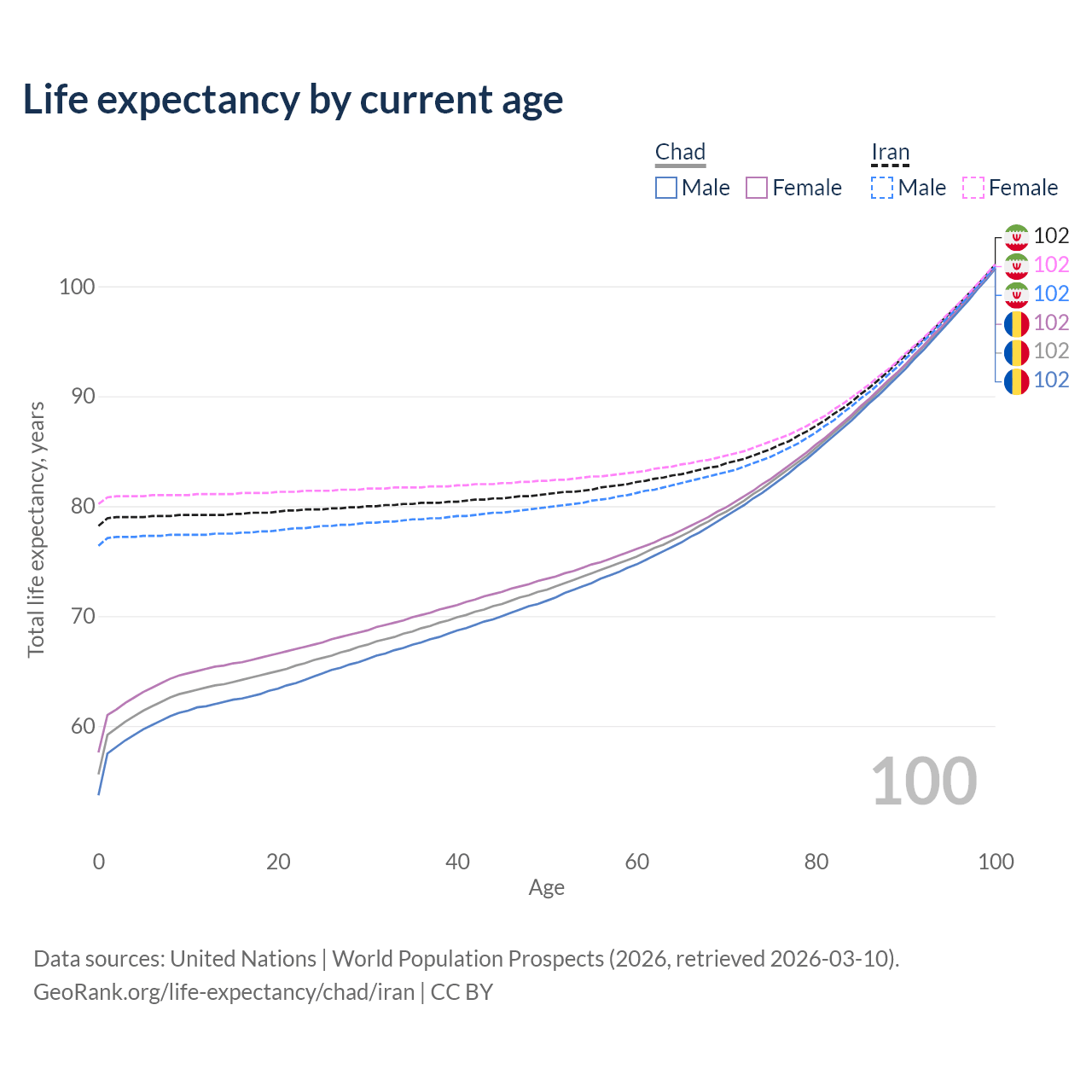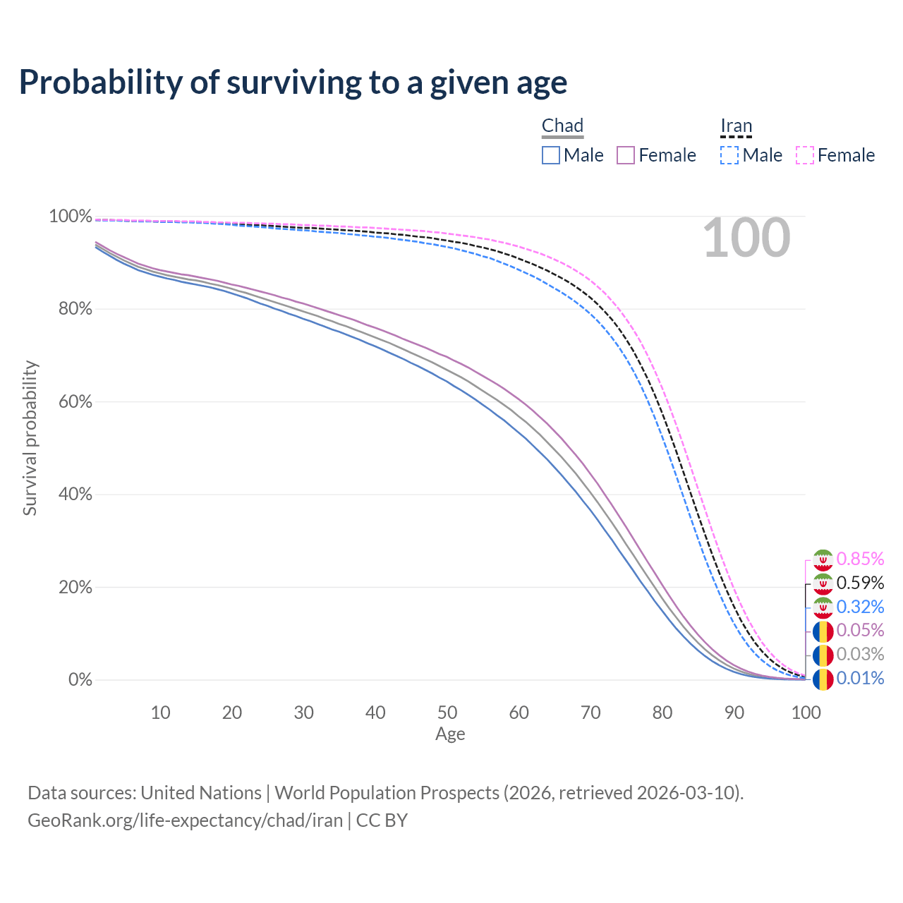 This life expectancy calculator shows the odds of living to 100, 95, 90, and below based on current age for both males and females in Chad and Iran, along with mean and median age of death. The calculations are based on the 2026 life tables (actuarial tables) from the UN World Population Prospects.