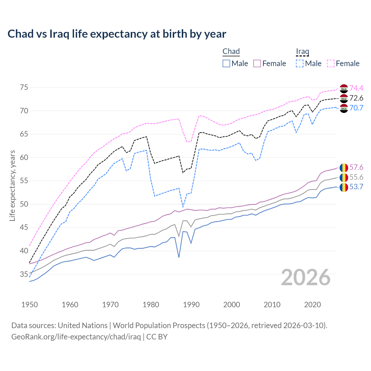 The average life expectancy at birth is 55.6 years in Chad vs 72.6 in Iraq. Chad is ranked 196/197 by life expectancy, and Iraq is 118/197. In Chad, the life expectancy is 53.7 years for males and 57.6 years for females. In Iraq, it's 70.7 years for males and 74.4 years for females.