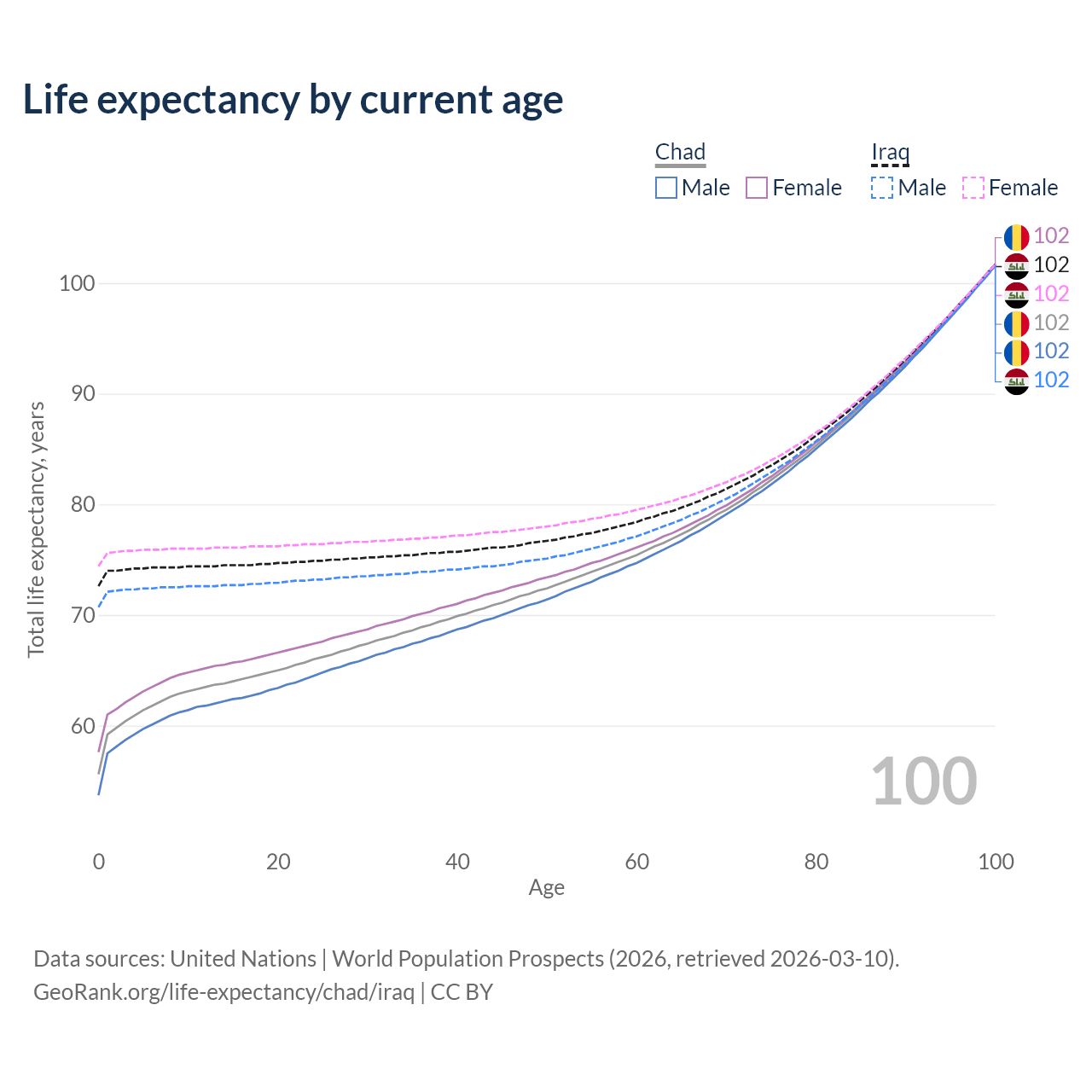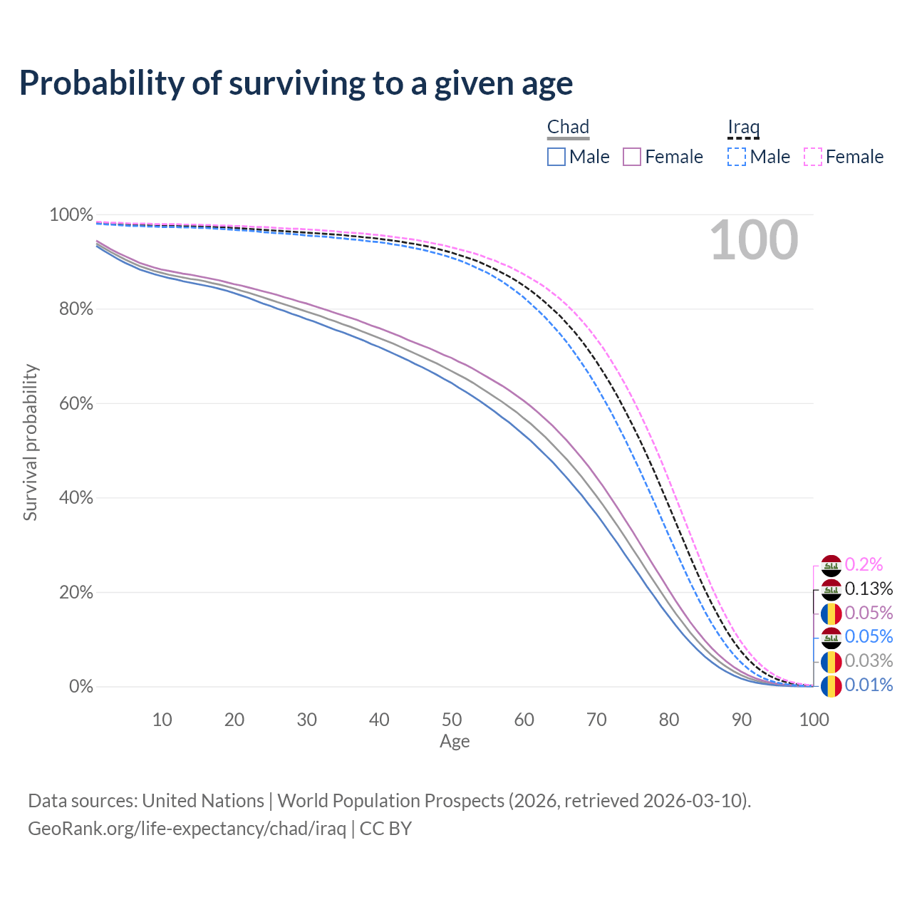 This life expectancy calculator shows the odds of living to 100, 95, 90, and below based on current age for both males and females in Chad and Iraq, along with mean and median age of death. The calculations are based on the 2026 life tables (actuarial tables) from the UN World Population Prospects.