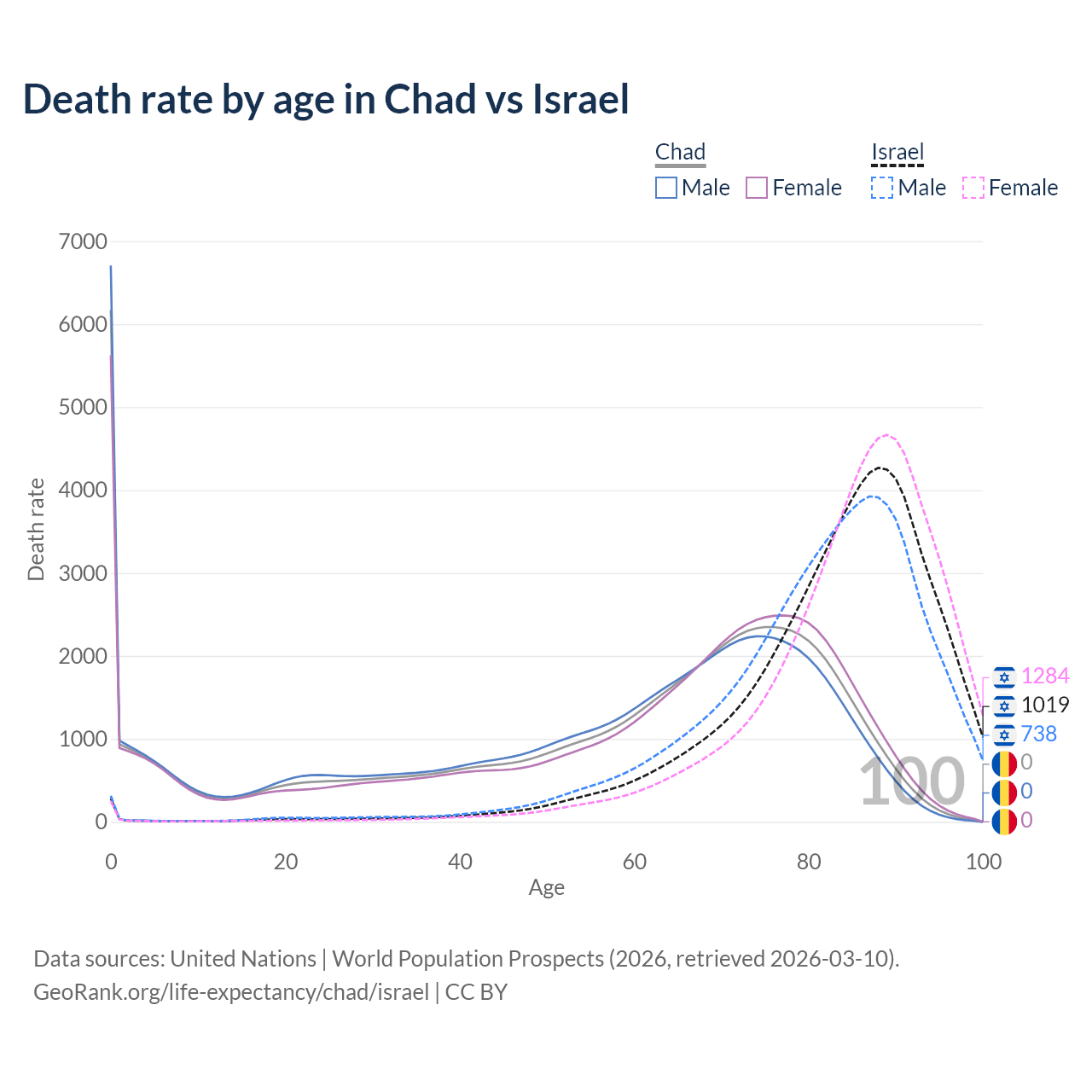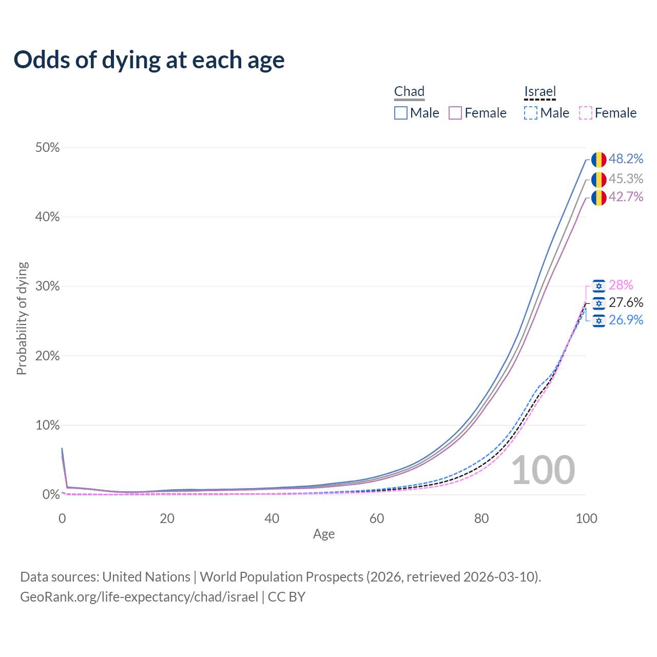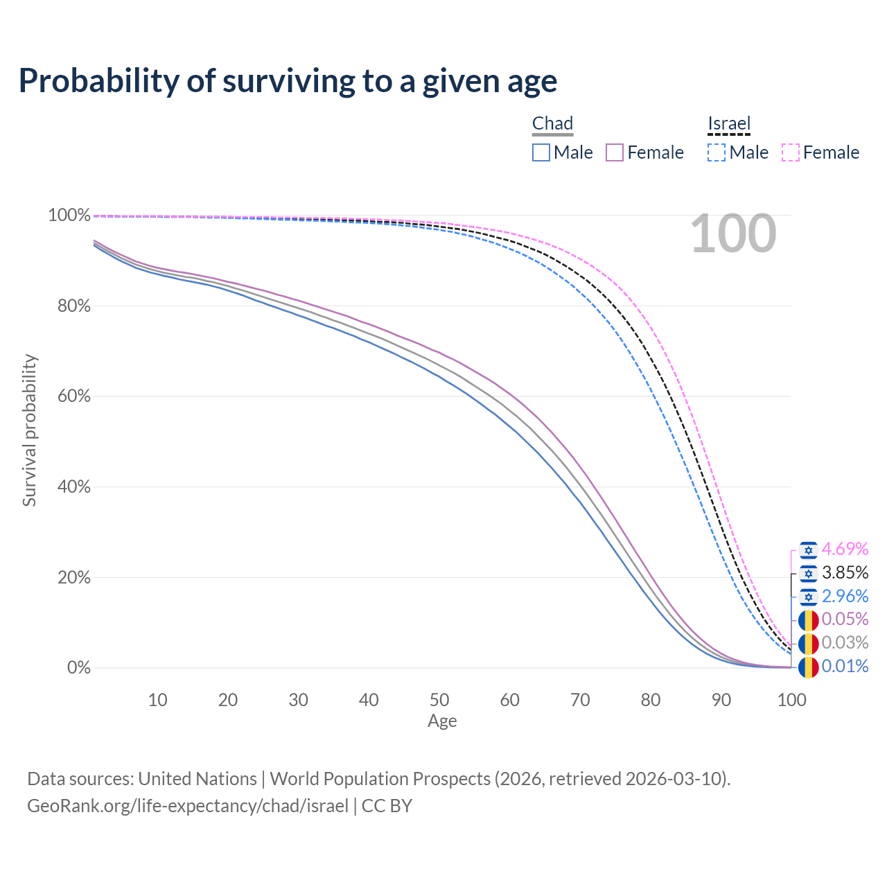 This life expectancy calculator shows the odds of living to 100, 95, 90, and below based on current age for both males and females in Chad and Israel, along with mean and median age of death. The calculations are based on the 2026 life tables (actuarial tables) from the UN World Population Prospects.