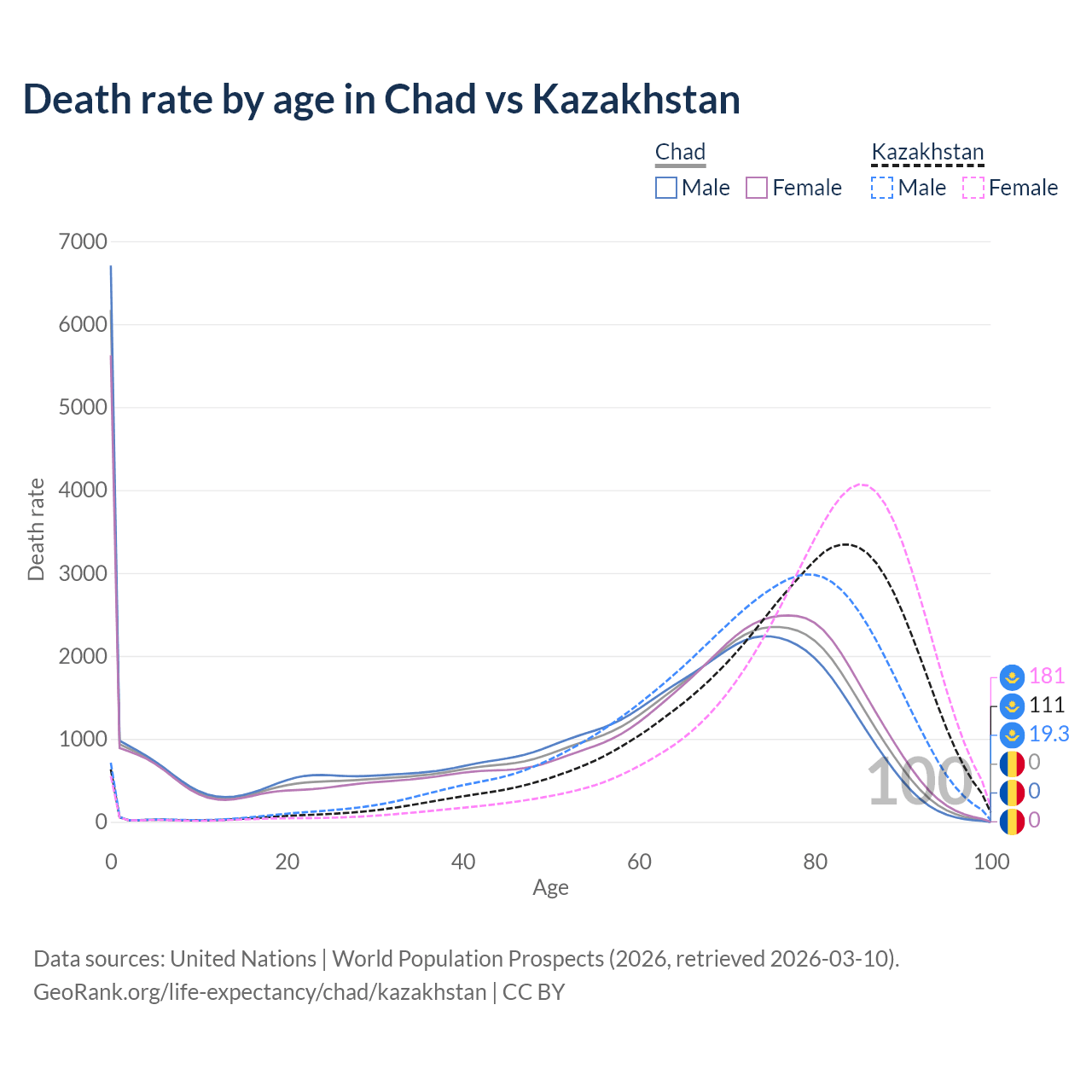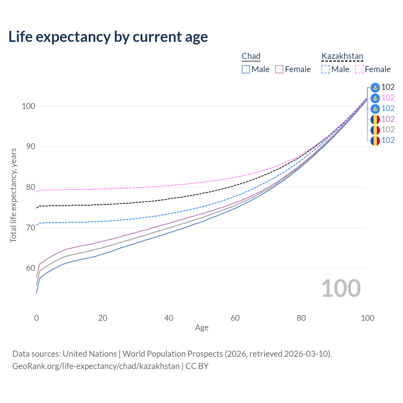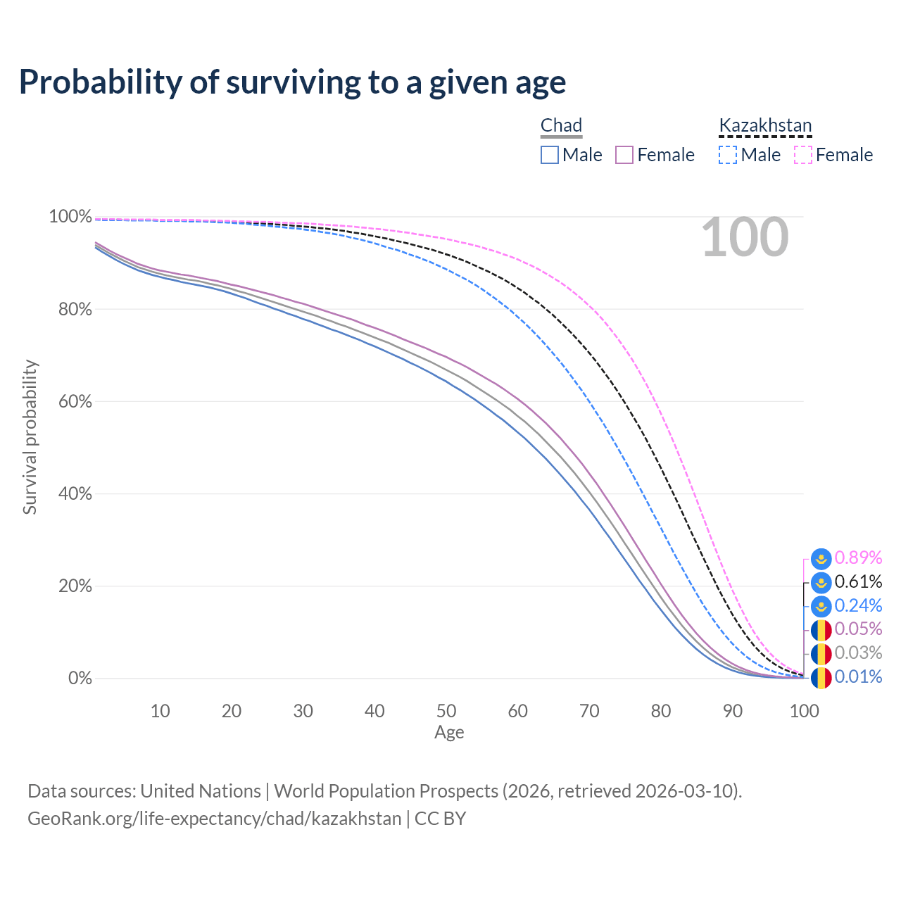 This life expectancy calculator shows the odds of living to 100, 95, 90, and below based on current age for both males and females in Chad and Kazakhstan, along with mean and median age of death. The calculations are based on the 2026 life tables (actuarial tables) from the UN World Population Prospects.