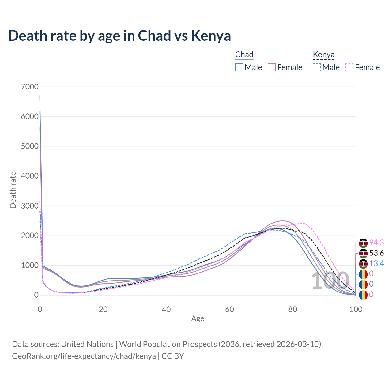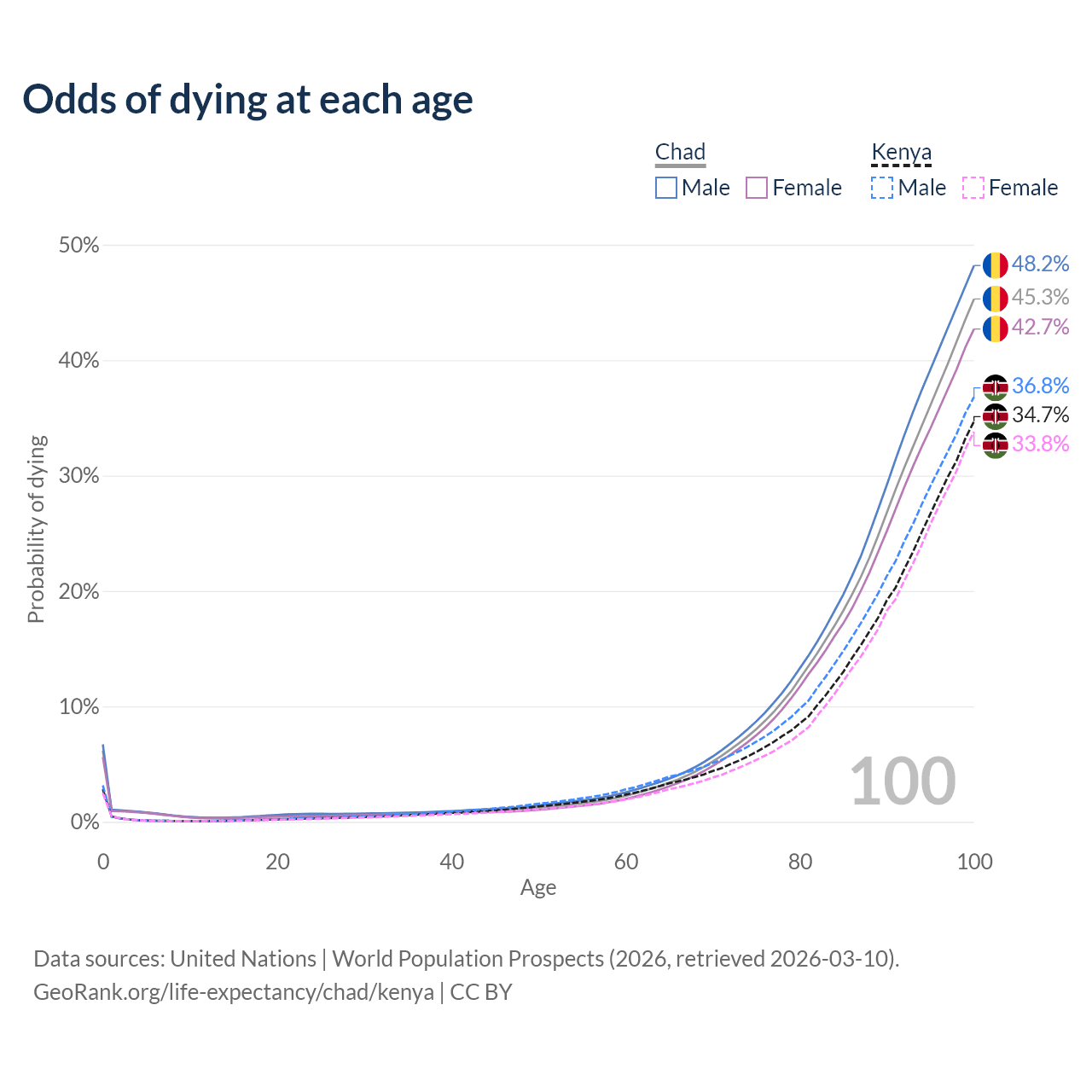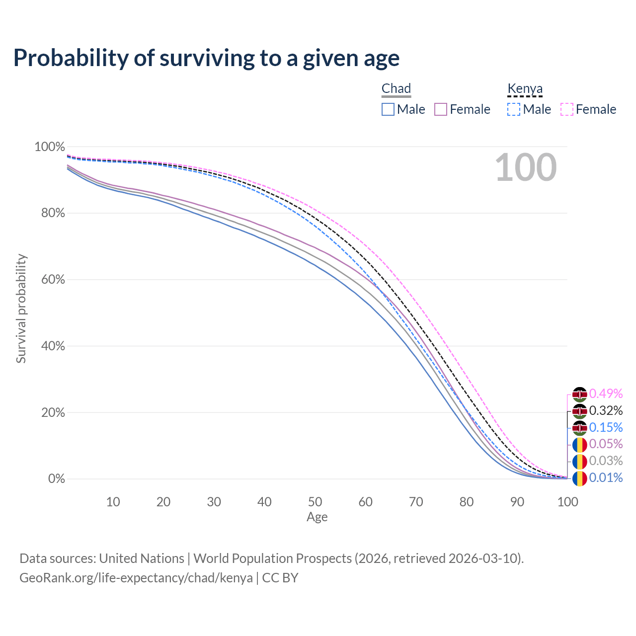 This life expectancy calculator shows the odds of living to 100, 95, 90, and below based on current age for both males and females in Chad and Kenya, along with mean and median age of death. The calculations are based on the 2026 life tables (actuarial tables) from the UN World Population Prospects.