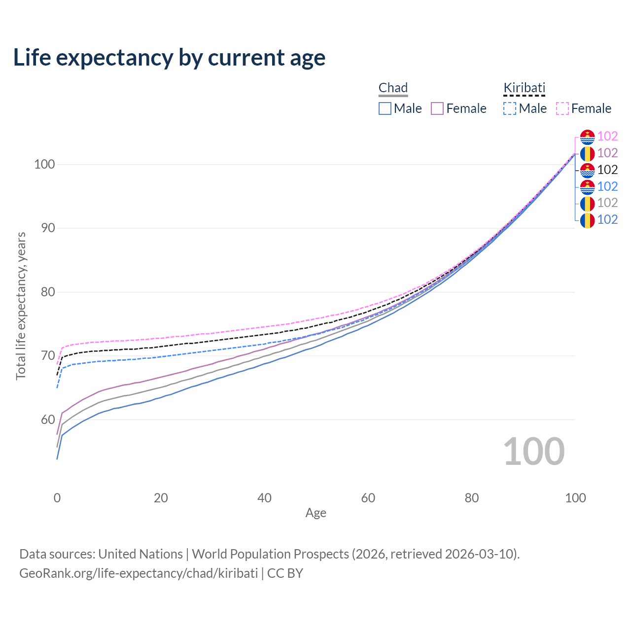 This life expectancy calculator shows the odds of living to 100, 95, 90, and below based on current age for both males and females in Chad and Kiribati, along with mean and median age of death. The calculations are based on the 2026 life tables (actuarial tables) from the UN World Population Prospects.