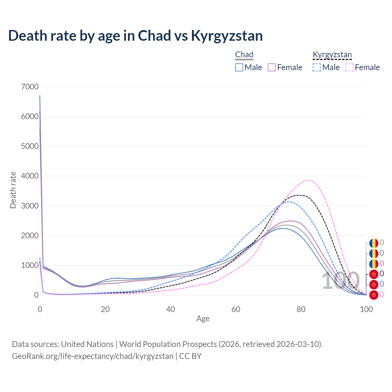 In Chad, the most common age of death is 0, compared to 79 in Kyrgyzstan. The median age of death is 64.8 in Chad and 75.6 in Kyrgyzstan, meaning only half of each cohort is expected to live past that age.