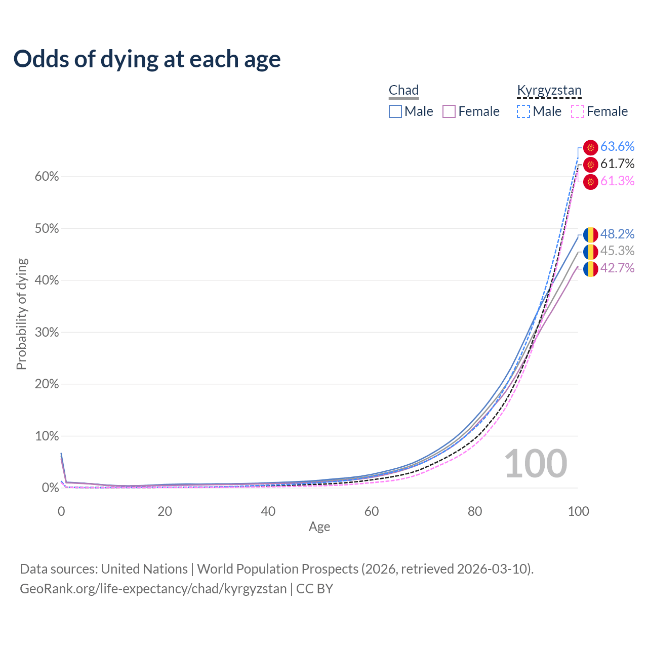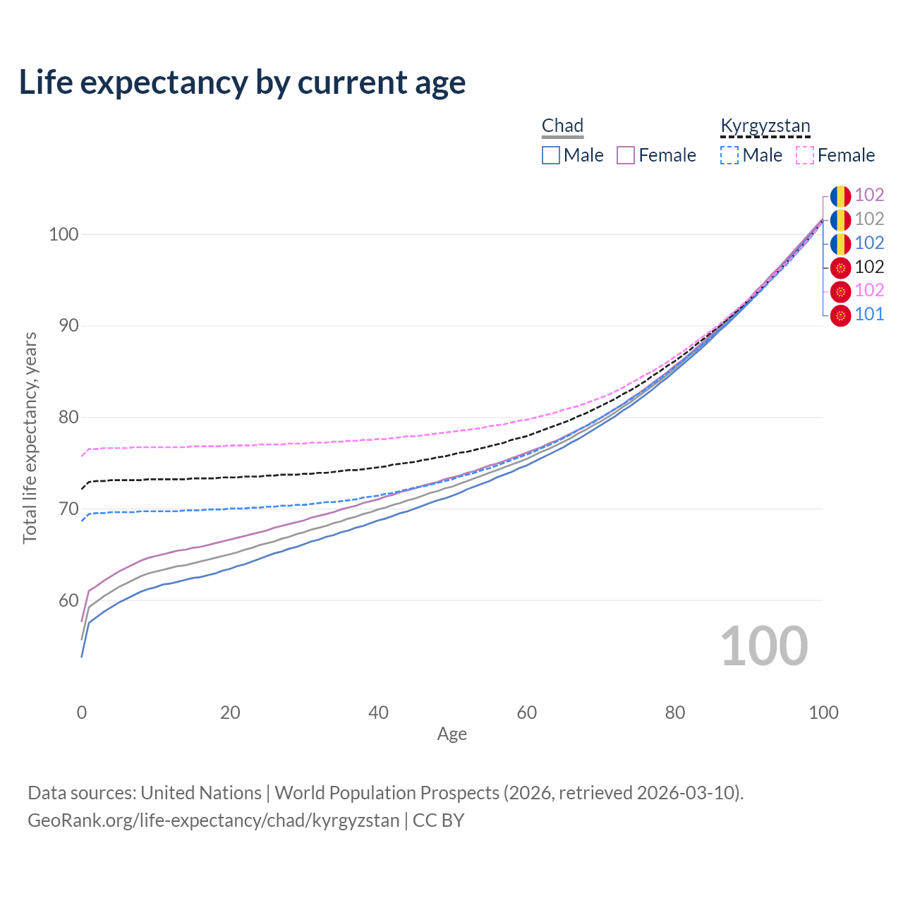 This life expectancy calculator shows the odds of living to 100, 95, 90, and below based on current age for both males and females in Chad and Kyrgyzstan, along with mean and median age of death. The calculations are based on the 2026 life tables (actuarial tables) from the UN World Population Prospects.