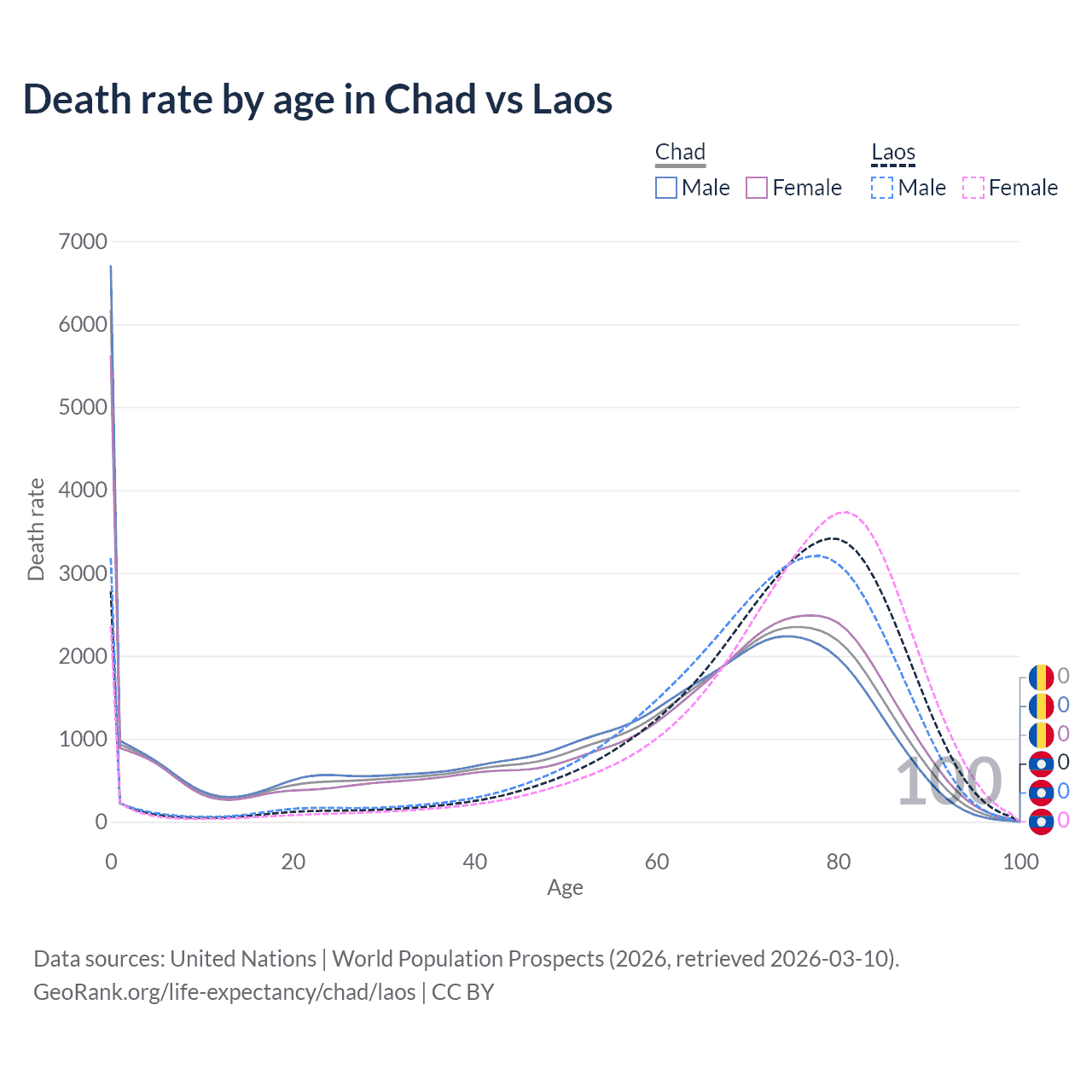 In Chad, the most common age of death is 0, compared to 79 in Laos. The median age of death is 64.8 in Chad and 74.7 in Laos, meaning only half of each cohort is expected to live past that age.