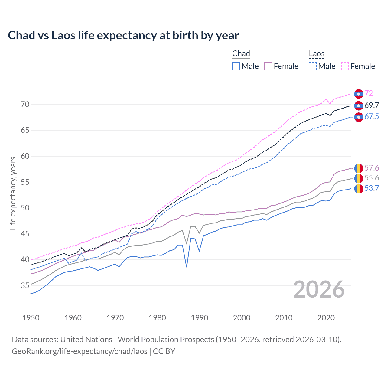 The average life expectancy at birth is 55.6 years in Chad vs 69.7 in Laos. Chad is ranked 196/197 by life expectancy, and Laos is 139/197. In Chad, the life expectancy is 53.7 years for males and 57.6 years for females. In Laos, it's 67.5 years for males and 72 years for females.