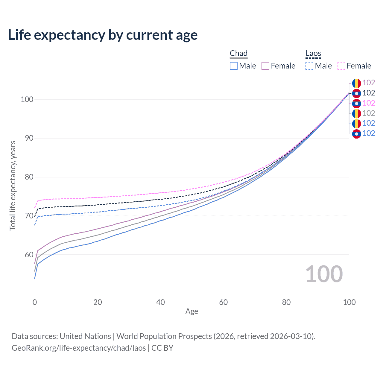 This life expectancy calculator shows the odds of living to 100, 95, 90, and below based on current age for both males and females in Chad and Laos, along with mean and median age of death. The calculations are based on the 2026 life tables (actuarial tables) from the UN World Population Prospects.