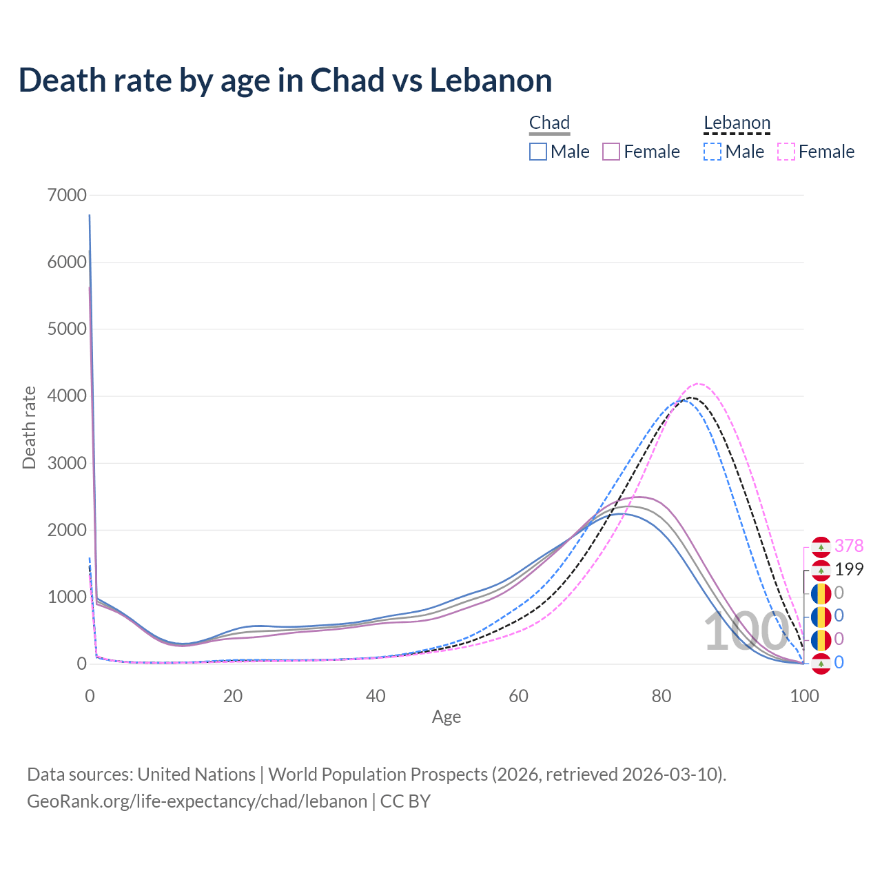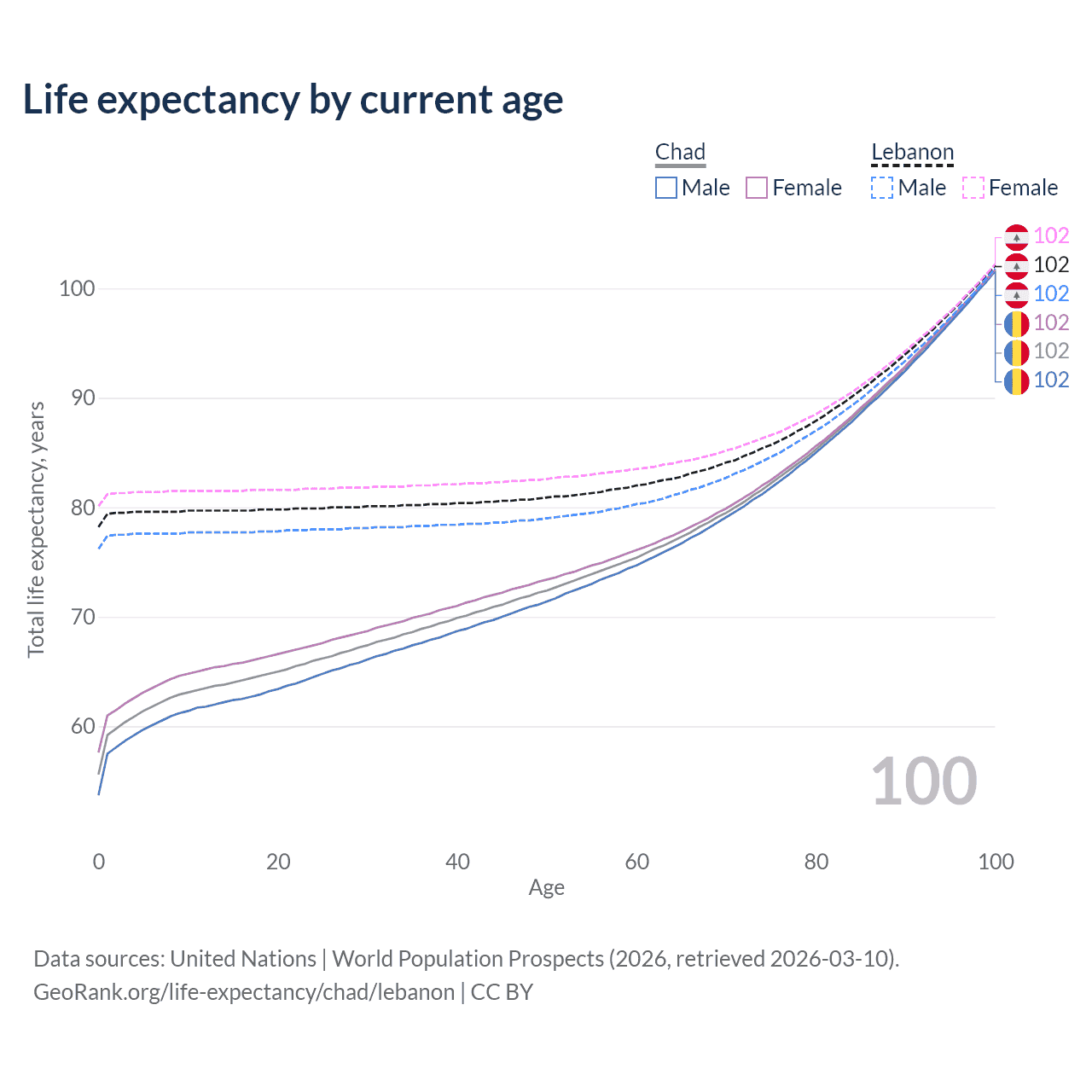 This life expectancy calculator shows the odds of living to 100, 95, 90, and below based on current age for both males and females in Chad and Lebanon, along with mean and median age of death. The calculations are based on the 2026 life tables (actuarial tables) from the UN World Population Prospects.