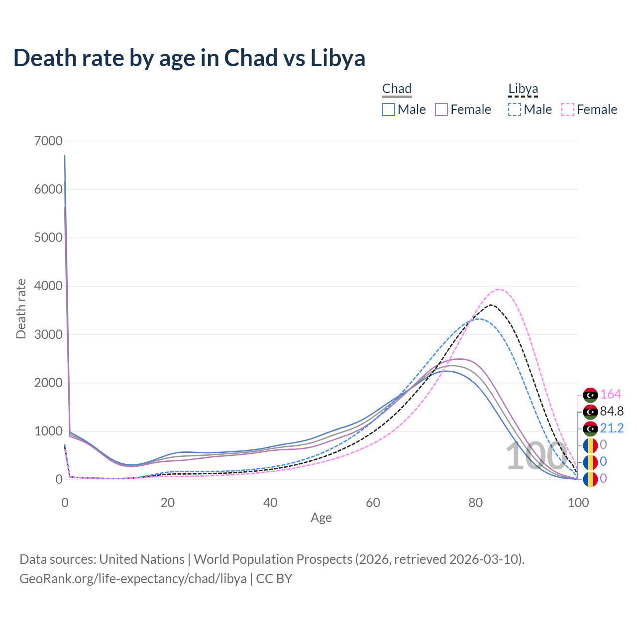 The average life expectancy at birth is 55.6 years in Chad vs 75.2 in Libya. Chad is ranked 196/197 by life expectancy, and Libya is 92/197. In Chad, the life expectancy is 53.7 years for males and 57.6 years for females. In Libya, it's 72.7 years for males and 77.8 years for females.