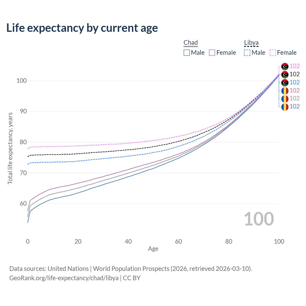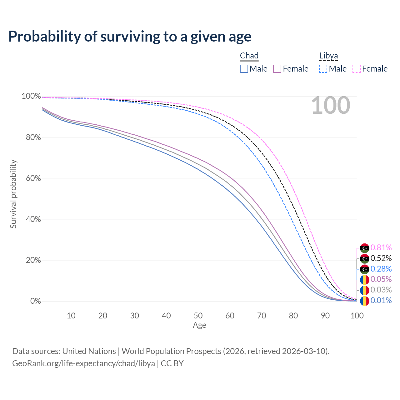 This life expectancy calculator shows the odds of living to 100, 95, 90, and below based on current age for both males and females in Chad and Libya, along with mean and median age of death. The calculations are based on the 2026 life tables (actuarial tables) from the UN World Population Prospects.
