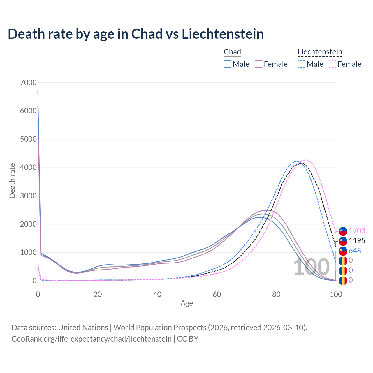 In Chad, the most common age of death is 0, compared to 89 in Liechtenstein. The median age of death is 64.8 in Chad and 86.3 in Liechtenstein, meaning only half of each cohort is expected to live past that age.
