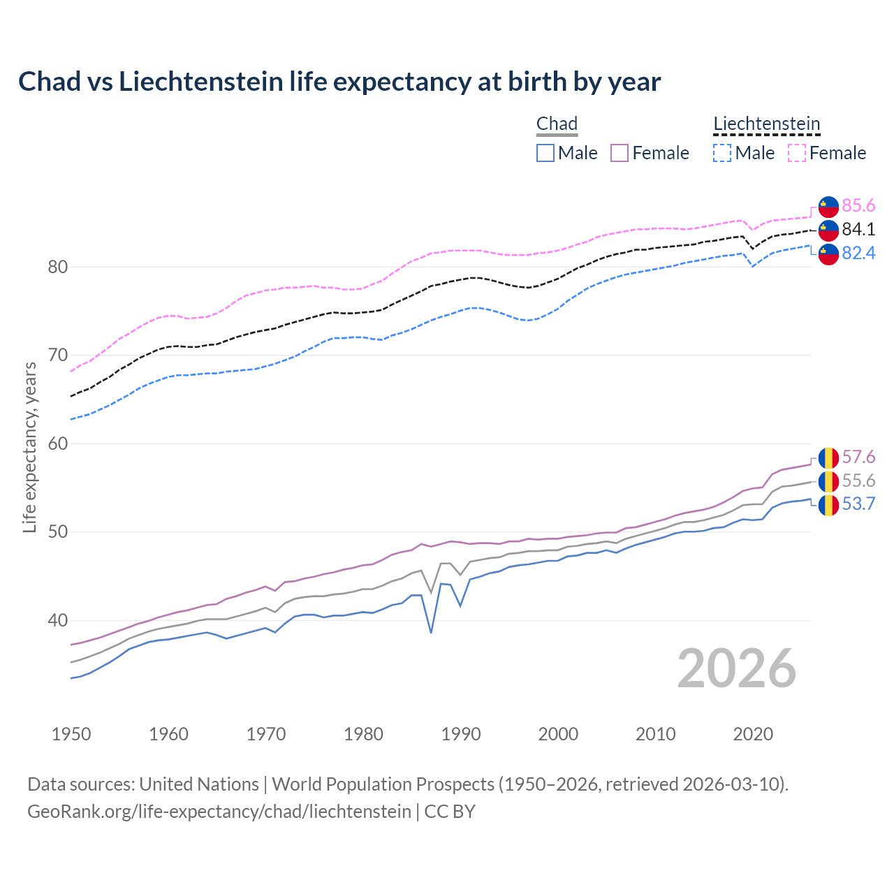 The average life expectancy at birth is 55.6 years in Chad vs 84.1 in Liechtenstein. Chad is ranked 196/197 by life expectancy, and Liechtenstein is 11/197. In Chad, the life expectancy is 53.7 years for males and 57.6 years for females. In Liechtenstein, it's 82.4 years for males and 85.6 years for females.