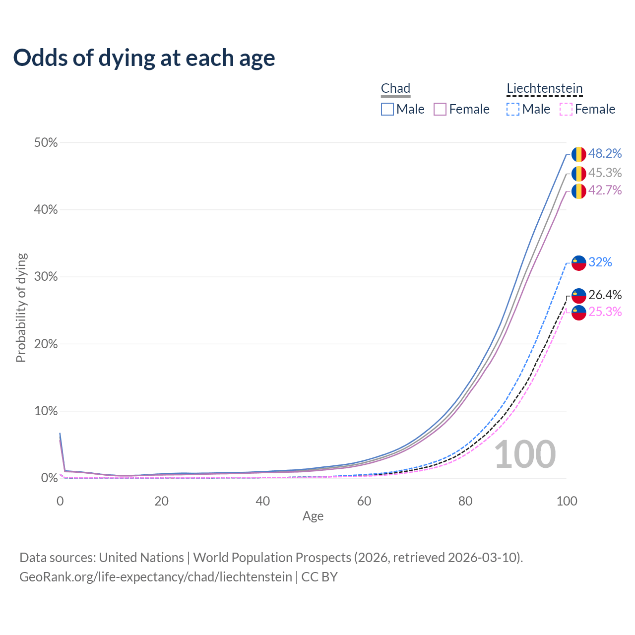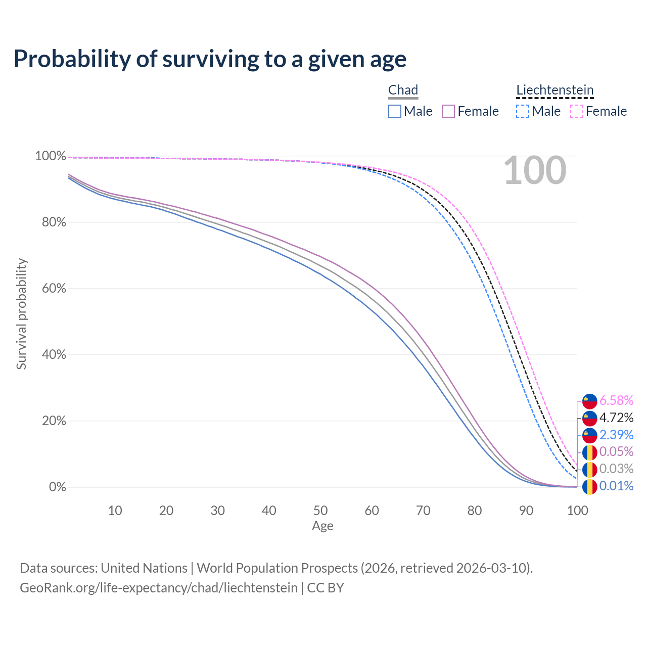 This life expectancy calculator shows the odds of living to 100, 95, 90, and below based on current age for both males and females in Chad and Liechtenstein, along with mean and median age of death. The calculations are based on the 2026 life tables (actuarial tables) from the UN World Population Prospects.