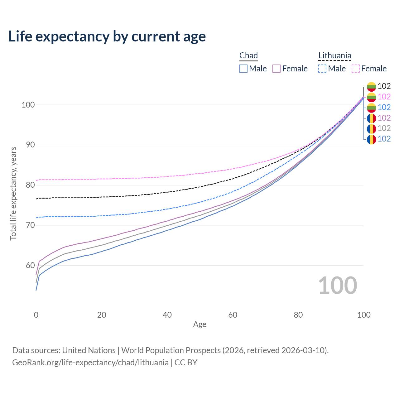 This life expectancy calculator shows the odds of living to 100, 95, 90, and below based on current age for both males and females in Chad and Lithuania, along with mean and median age of death. The calculations are based on the 2026 life tables (actuarial tables) from the UN World Population Prospects.