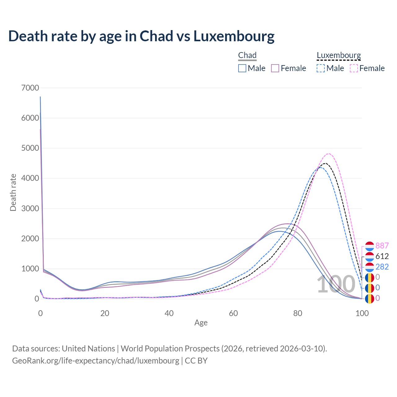 In Chad, the most common age of death is 0, compared to 89 in Luxembourg. The median age of death is 64.8 in Chad and 85.7 in Luxembourg, meaning only half of each cohort is expected to live past that age.