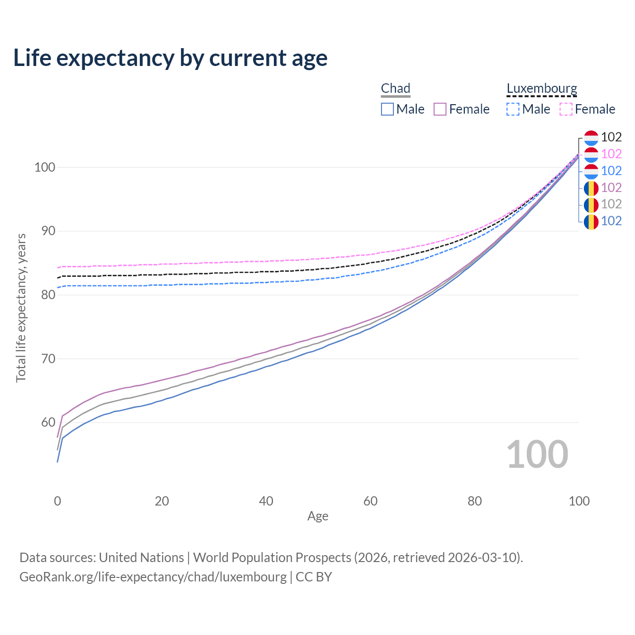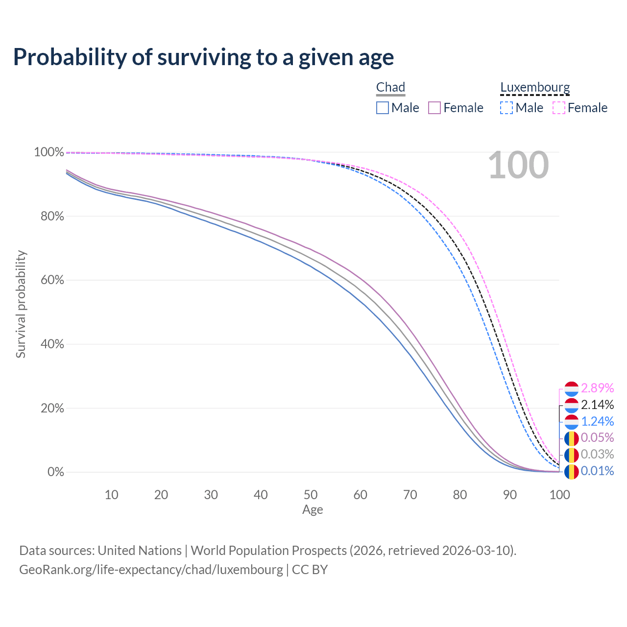 This life expectancy calculator shows the odds of living to 100, 95, 90, and below based on current age for both males and females in Chad and Luxembourg, along with mean and median age of death. The calculations are based on the 2026 life tables (actuarial tables) from the UN World Population Prospects.