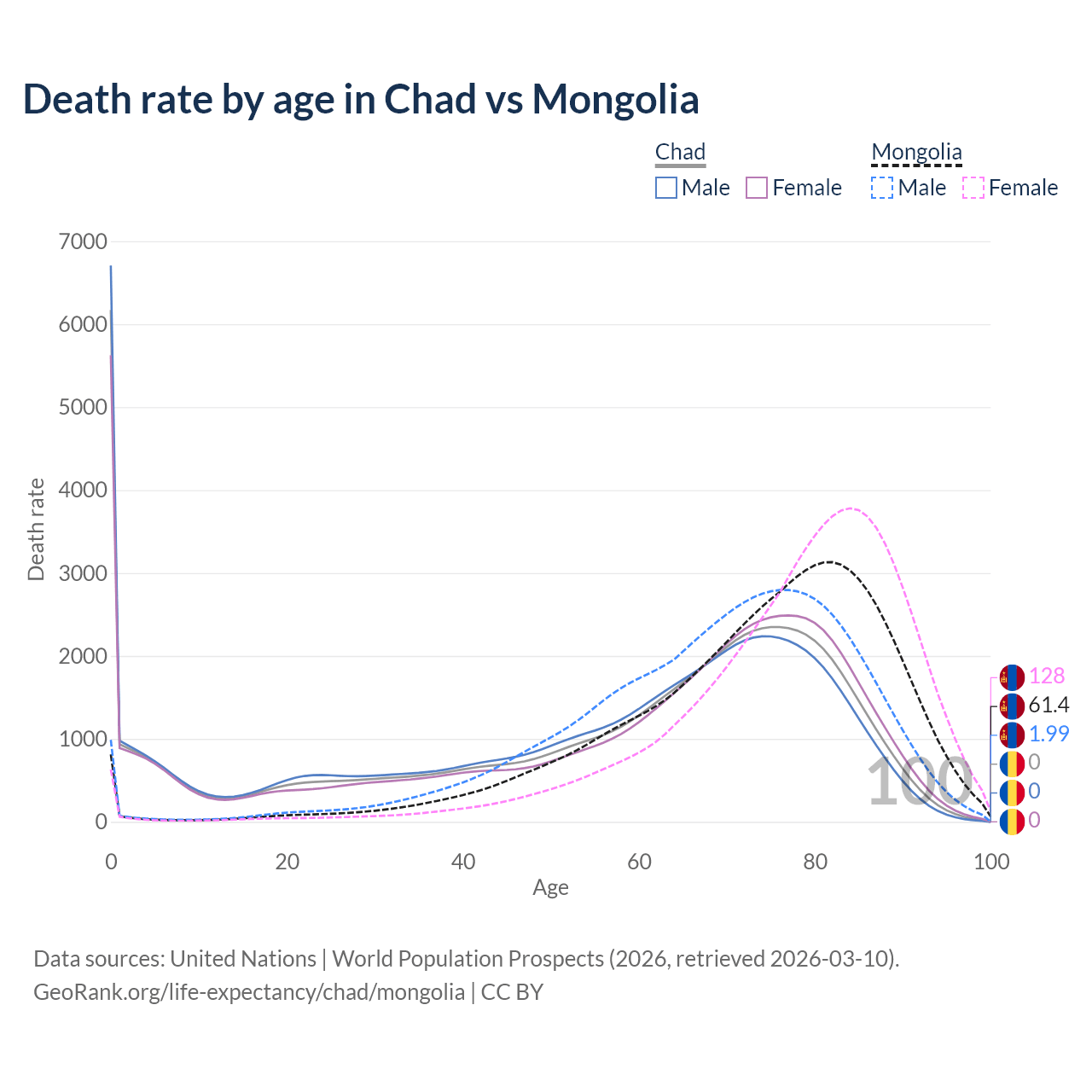 The average life expectancy at birth is 55.6 years in Chad vs 72.5 in Mongolia. Chad is ranked 196/197 by life expectancy, and Mongolia is 120/197. In Chad, the life expectancy is 53.7 years for males and 57.6 years for females. In Mongolia, it's 68 years for males and 77.1 years for females.