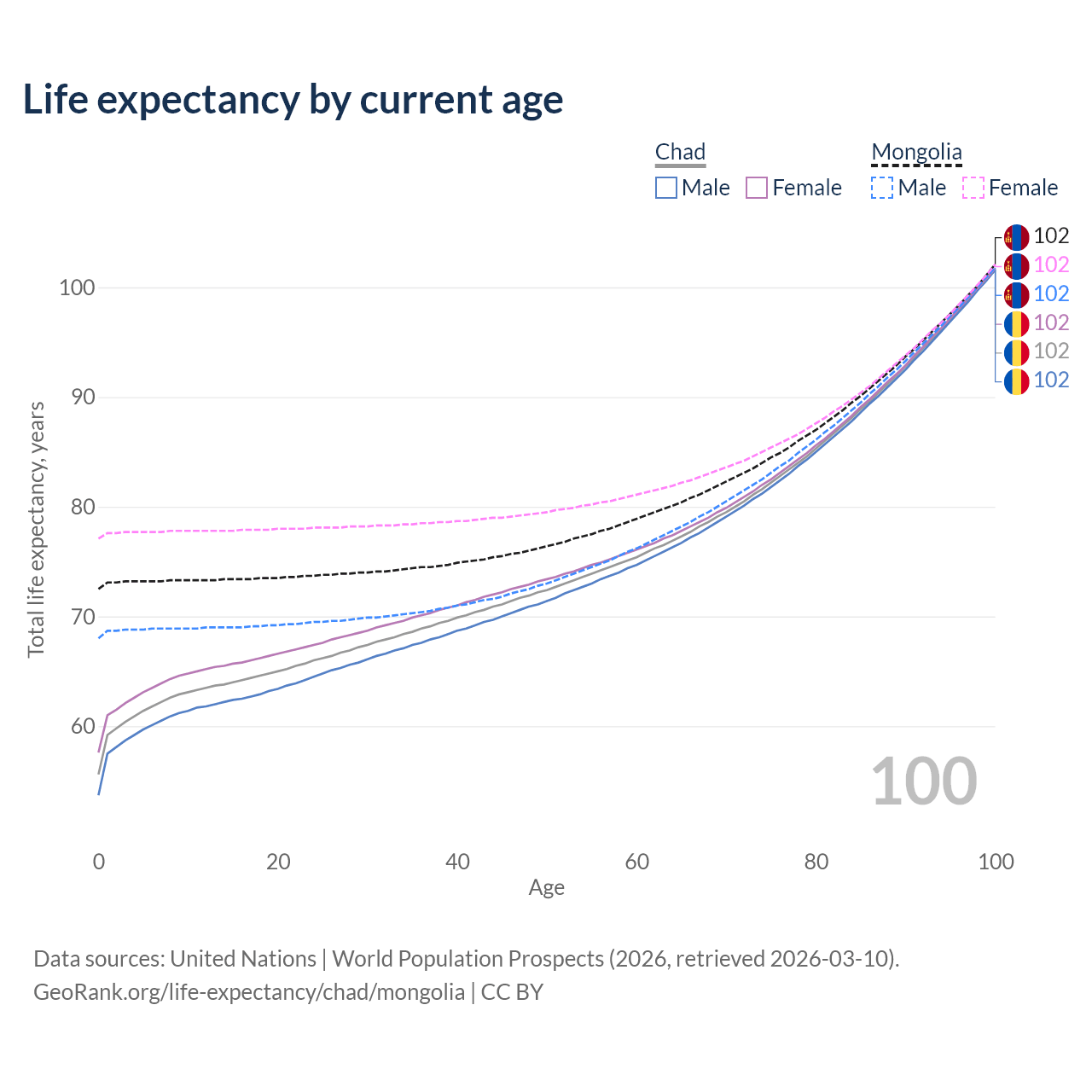 This life expectancy calculator shows the odds of living to 100, 95, 90, and below based on current age for both males and females in Chad and Mongolia, along with mean and median age of death. The calculations are based on the 2026 life tables (actuarial tables) from the UN World Population Prospects.