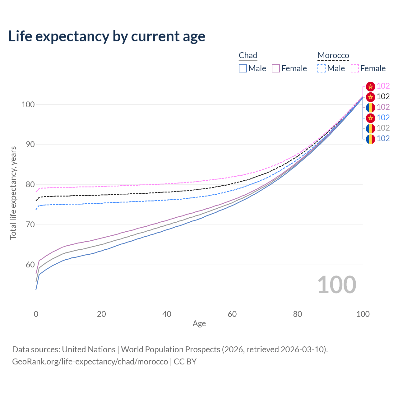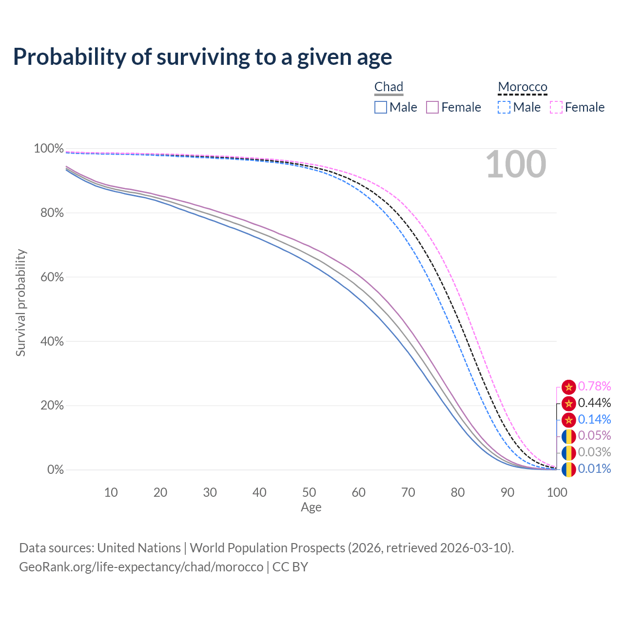 This life expectancy calculator shows the odds of living to 100, 95, 90, and below based on current age for both males and females in Chad and Morocco, along with mean and median age of death. The calculations are based on the 2026 life tables (actuarial tables) from the UN World Population Prospects.