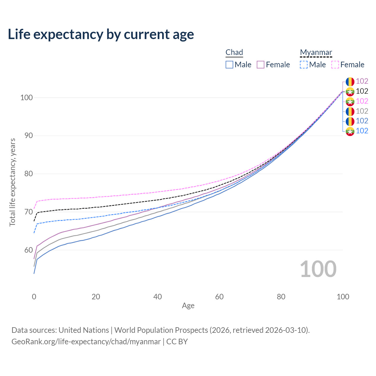 This life expectancy calculator shows the odds of living to 100, 95, 90, and below based on current age for both males and females in Chad and Myanmar, along with mean and median age of death. The calculations are based on the 2026 life tables (actuarial tables) from the UN World Population Prospects.