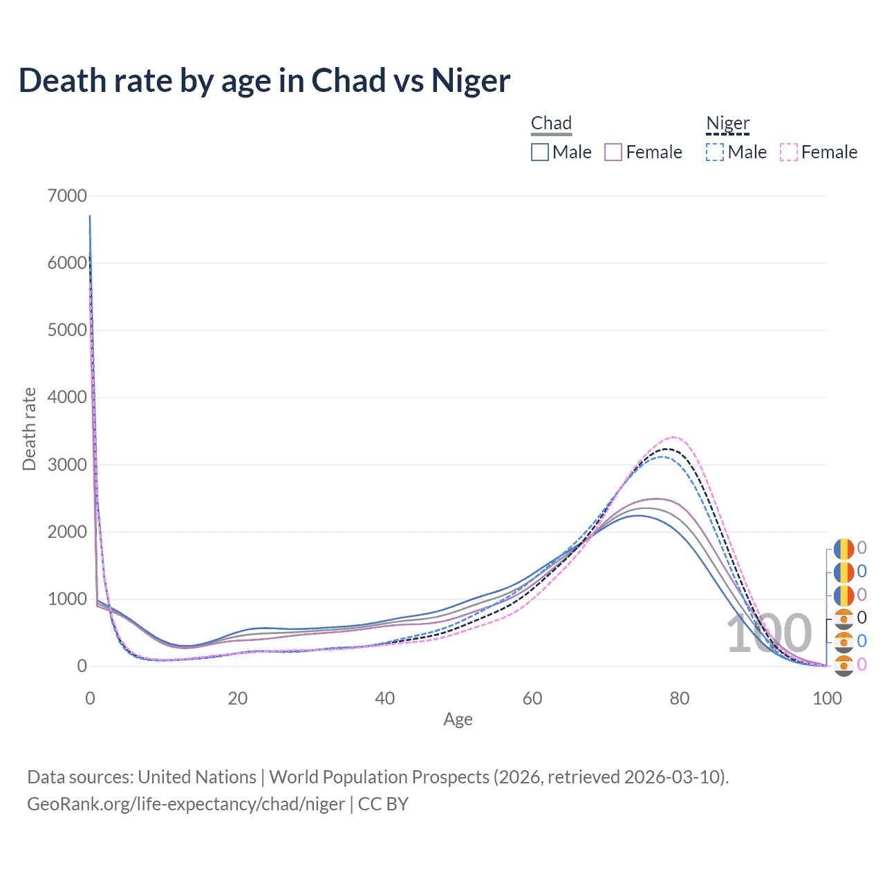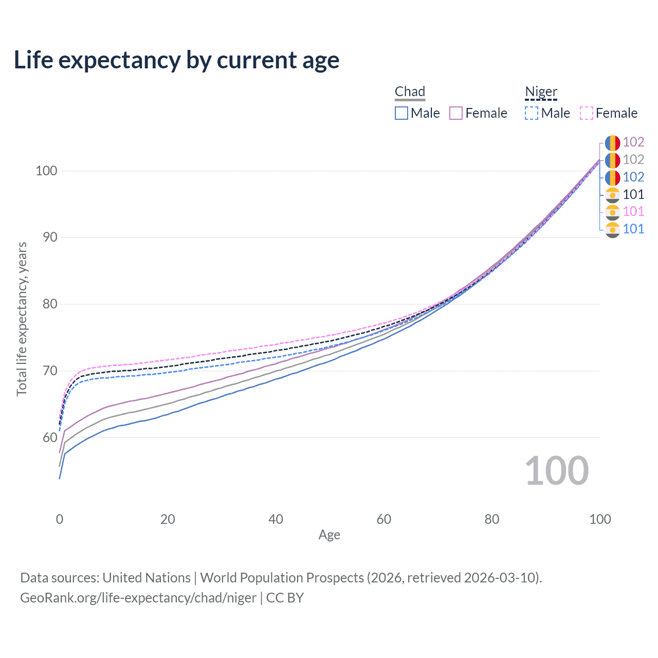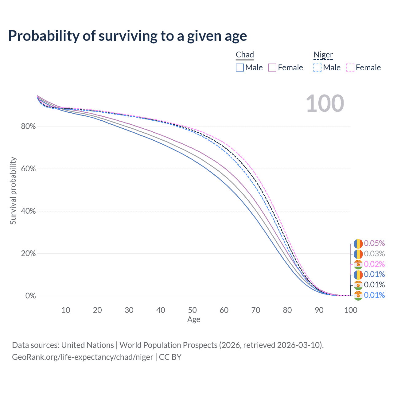 This life expectancy calculator shows the odds of living to 100, 95, 90, and below based on current age for both males and females in Chad and Niger, along with mean and median age of death. The calculations are based on the 2026 life tables (actuarial tables) from the UN World Population Prospects.