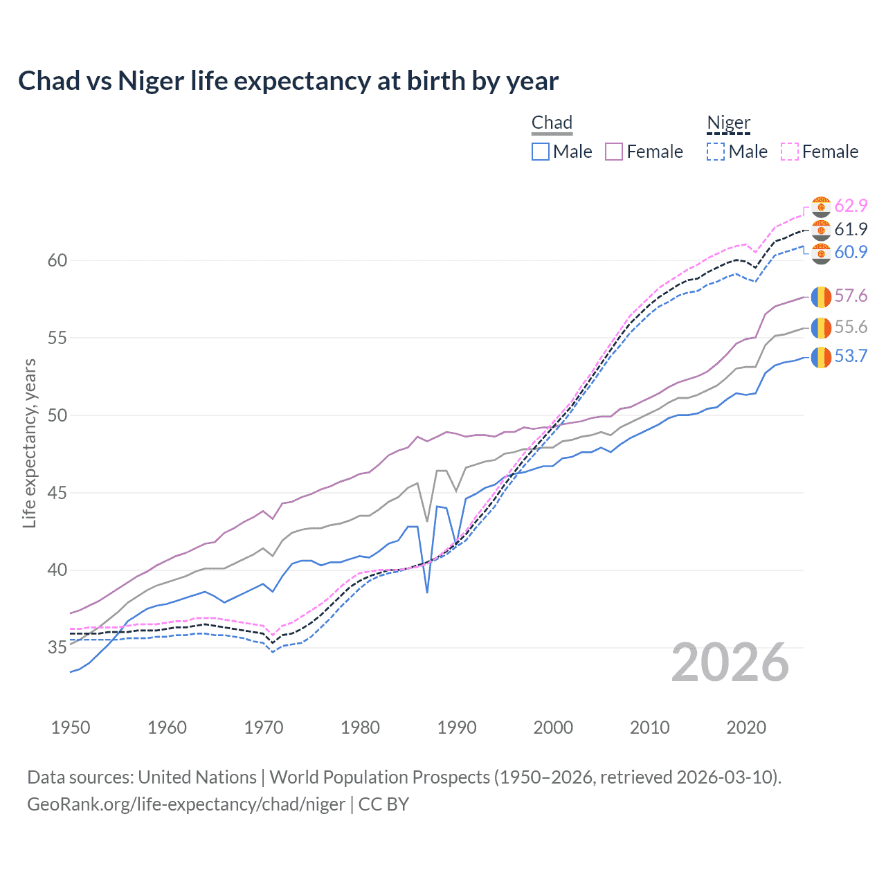 The average life expectancy at birth is 55.6 years in Chad vs 61.9 in Niger. Chad is ranked 196/197 by life expectancy, and Niger is 187/197. In Chad, the life expectancy is 53.7 years for males and 57.6 years for females. In Niger, it's 60.9 years for males and 62.9 years for females.