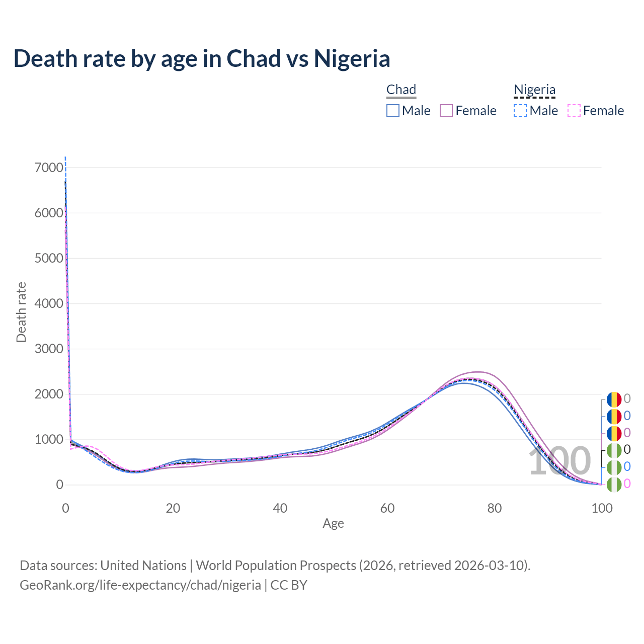 Note that this chart does not show rates per 100,000 population, as those would be skewed by age structure differences and reflect the demographics of Chad and Nigeria more than their death rates.